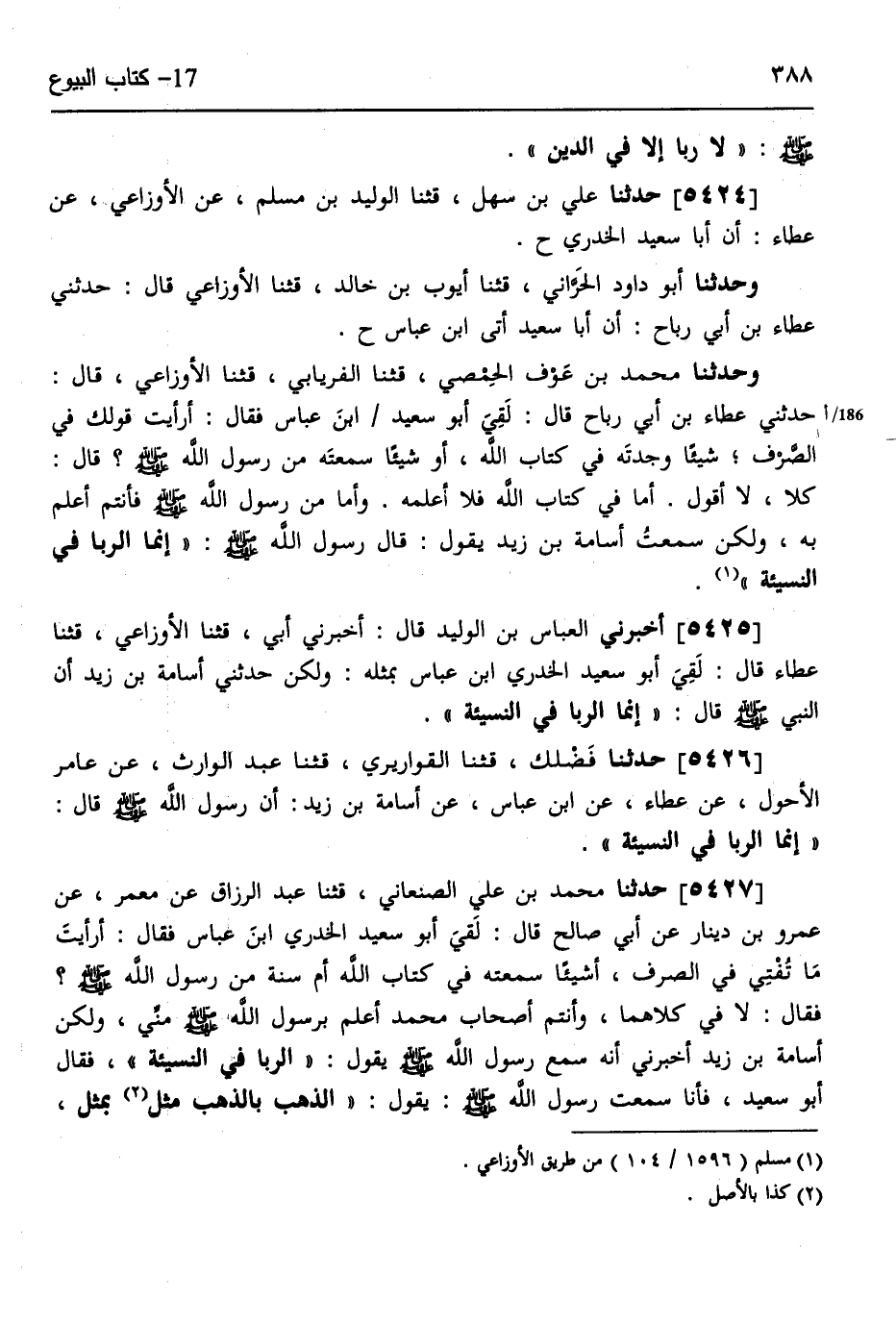 5425 - أَخْبَرَنِي الْعَبَّاسُ بْنُ الْوَلِيدِ، قَالَ: أَخْبَرَنِي أَبِي، قثنا الْأَوْزَاعِيُّ، قثنا عَطَاءٌ، قَالَ: لَقِيَ أَبُو سَعِيدٍ الْخُدْرِيُّ ابْنَ عَبَّاسٍ بِمِثْلِهِ، وَلَكِنْ حَدَّثَنِي أُسَامَةُ بْنُ زَيْدٍ، أَنَّ النَّبِيَّ صَلَّى اللهُ عَلَيْهِ وَسَلَّمَ قَالَ: «§إِنَّمَا الرِّبَا فِي النَّسِيئَةِ»
