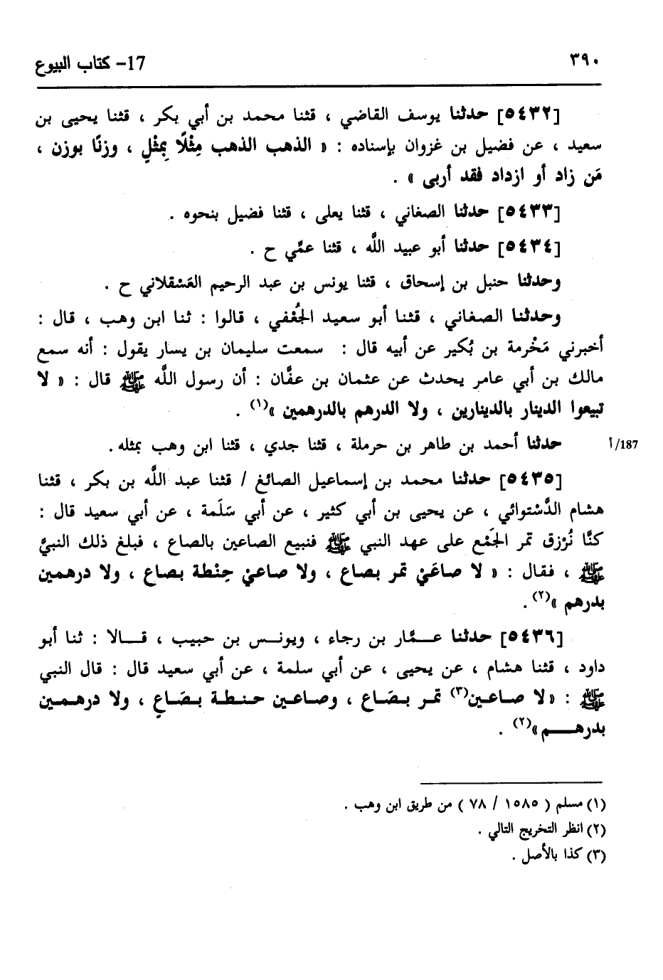 5435 - حَدَّثَنَا مُحَمَّدُ بْنُ إِسْمَاعِيلَ الصَّائِغُ، قثنا عَبْدُ اللَّهِ بْنُ بَكْرٍ، قثنا هِشَامٌ الدَّسْتُوَائِيُّ، عَنْ يَحْيَى بْنِ أَبِي كَثِيرٍ، عَنْ أَبِي سَلَمَةَ، عَنْ أَبِي سَعِيدٍ، قَالَ: كُنَّا نُرْزَقُ تَمْرَ الْجَمْعِ عَلَى عَهْدِ النَّبِيِّ صَلَّى اللهُ عَلَيْهِ وَسَلَّمَ، فَنَبِيعُ الصَّاعَيْنِ بِالصَّاعِ، فَبَلَغَ ذَلِكَ النَّبِيَّ صَلَّى اللهُ عَلَيْهِ وَسَلَّمَ، فَقَالَ: «§لَا صَاعَيْ تَمْرٍ بِصَاعٍ، وَلَا صَاعَيْ حِنْطَةٍ بِصَاعٍ، وَلَا دِرْهَمَيْنِ بِدِرْهَمٍ»