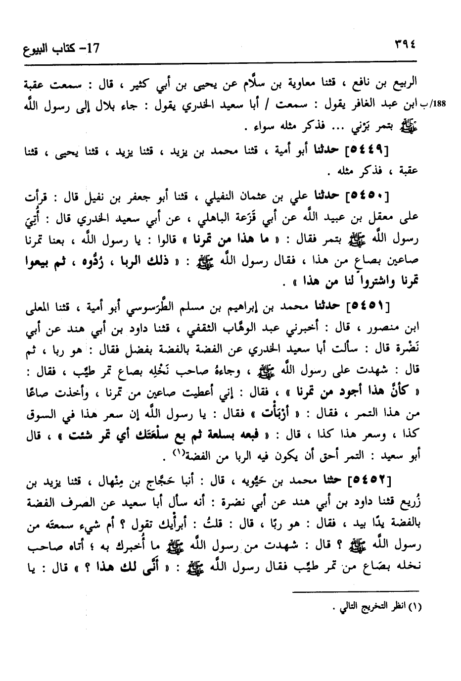 5450 - حَدَّثَنَا عَلِيُّ بْنُ عُثْمَانَ بْنِ النُّفَيْلِيِّ، قثنا أَبُو جَعْفَرِ بْنُ نُفَيْلٍ، قَالَ: قَرَأْتُ عَلَى مَعْقِلِ بْنِ عُبَيْدِ اللَّهِ عَنْ أَبِي قَزَعَةَ الْبَاهِلِيِّ، عَنْ أَبِي سَعِيدٍ الْخُدْرِيِّ، قَالَ: أُتِيَ رَسُولُ اللَّهِ صَلَّى اللهُ عَلَيْهِ وَسَلَّمَ بِتَمْرٍ فَقَالَ: «مَا هَذَا مِنْ تَمْرِنَا» قَالُوا: يَا رَسُولَ اللَّهِ، بِعْنَا تَمْرَنَا صَاعَيْنِ بِصَاعٍ مِنْ هَذَا، فَقَالَ رَسُولُ اللَّهِ صَلَّى اللهُ عَلَيْهِ وَسَلَّمَ ذَلِكَ: «§الرِّبَا رُدُّوهُ، ثُمَّ بِيعُوا تَمْرَنَا، وَاشْتَرُوا لَنَا مِنْ هَذَا»