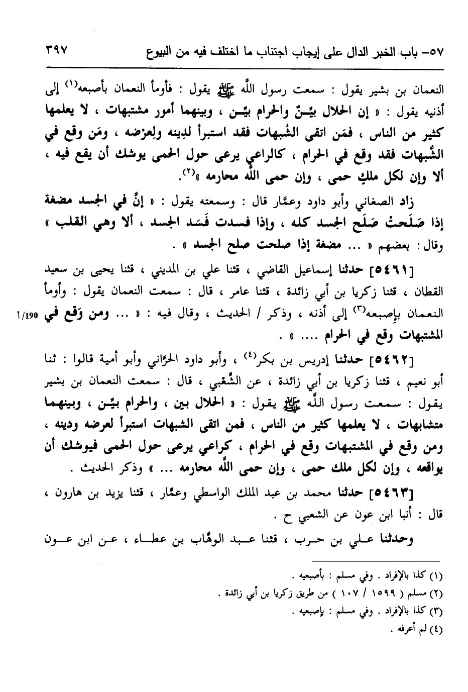 5461 - حَدَّثَنَا إِسْمَاعِيلُ الْقَاضِي، قثنا عَلِيُّ بْنُ الْمَدِينِيِّ، قثنا يَحْيَى بْنُ سَعِيدٍ الْقَطَّانُ، قثنا زَكَرِيَّا بْنُ أَبِي زَائِدَةَ، قثنا عَامِرٌ، قَالَ: سَمِعْتُ النُّعْمَانَ، يَقُولُ وَأَوْمَأَ النُّعْمَانِ بِإِصْبَعِهِ إِلَى أُذُنِهِ وَذَكَرَ الْحَدِيثَ وَقَالَ فِيهِ: «§وَمَنْ وَقَعَ فِي الْمُشْتَبِهَاتِ وَقَعَ فِي الْحَرَامِ»