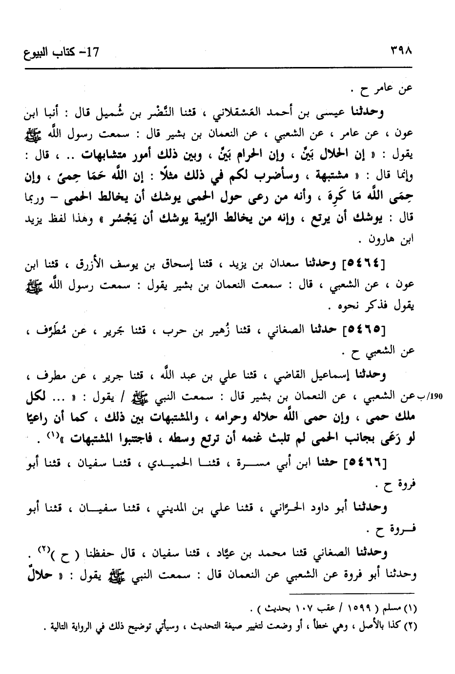 5466 - حثنا ابْنُ أَبِي مَسَرَّةَ، قثنا الْحُمَيْدِيُّ، قثنا سُفْيَانُ، قثنا أَبُو فَرْوَةَ، ح وَحَدَّثَنَا أَبُو دَاوُدَ الْحَرَّانِيُّ، قثنا عَلِيُّ بْنُ الْمَدِينِيِّ، قثنا سُفْيَانُ، قثنا أَبُو فَرْوَةَ، ح وَحَدَّثَنَا الصَّغَانِيُّ، قثنا مُحَمَّدُ بْنُ عَيَّادٍ، قثنا سُفْيَانُ، قَالَ: حَفِظْنَا ح وَحَدَّثَنَا أَبُو فَرْوَةَ، عَنِ الشَّعْبِيِّ، عَنِ النُّعْمَانِ، قَالَ: سَمِعْتُ النَّبِيَّ صَلَّى اللهُ عَلَيْهِ وَسَلَّمَ يَقُولُ -[399]-: «§حَلَالٌ بَيِّنٌ وَحَرَامٌ بَيِّنٌ وَشُبُهَاتٌ بَيْنَ ذَلِكَ، فَمَنْ تَرَكَ مَا اشْتَبَهَ عَلَيْهِ مِنَ الْإِثْمِ، فَهُوَ لِمَا اسْتَبَانَ أَتْرَكُ، وَمَنِ اجْتَرَأَ عَلَى مَا شَكَّ فِيهِ يُوشِكُ أَنْ يُوَاقِعَ الْحَرَامَ إِنَّ لِكُلِّ مَلِكٍ حِمًى، وَإِنَّ حِمَى اللَّهِ فِي الْأَرْضِ مَعَاصِيهِ» ،