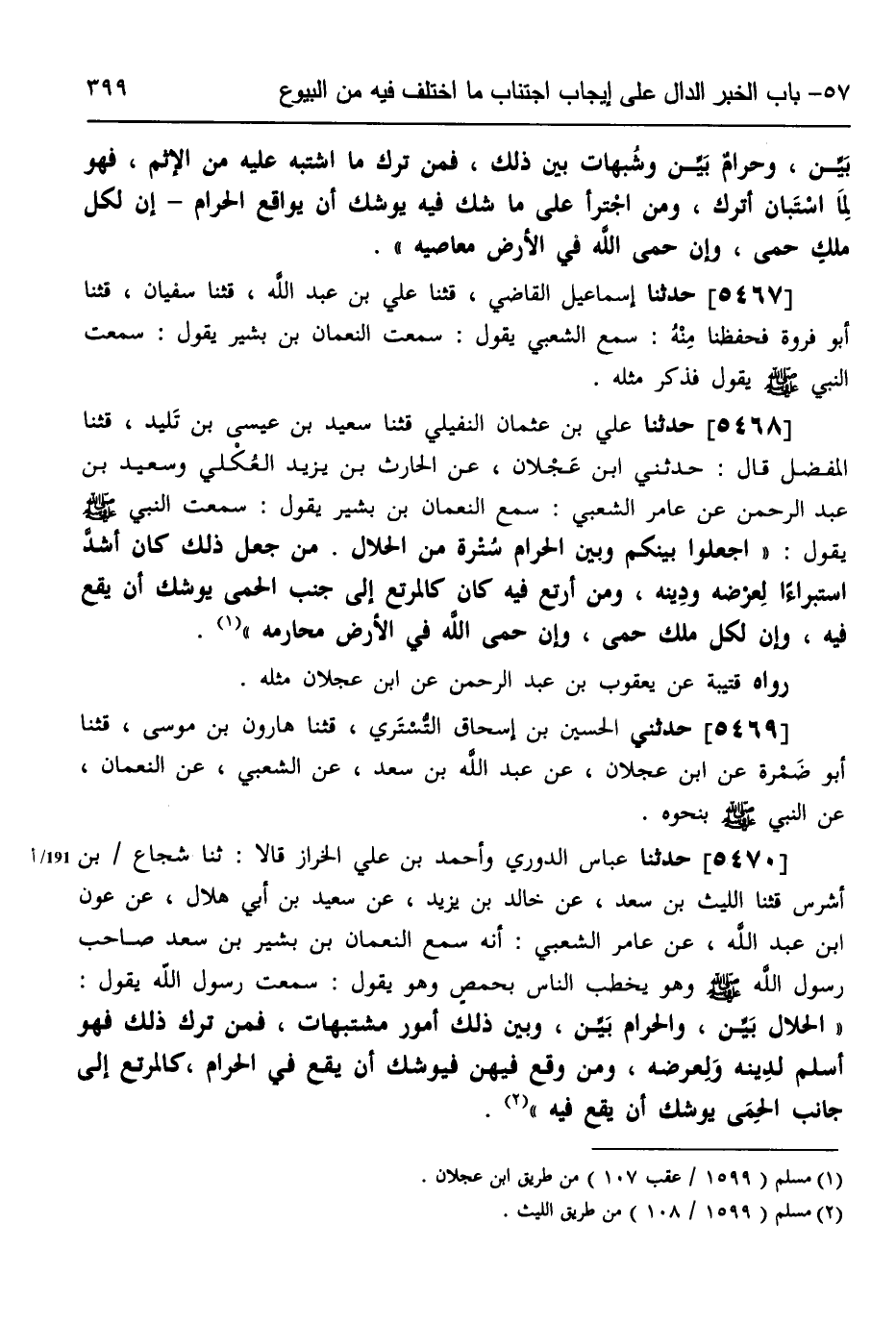 5470 - حَدَّثَنَا عَبَّاسٌ الدُّورِيُّ، وَأَحْمَدُ بْنُ عَلِيٍّ الْخَرَّازُ، قَالَا: ثَنَا شُجَاعُ بْنُ أَشْرَسَ، قثنا اللَّيْثُ بْنُ سَعْدٍ، عَنْ خَالِدِ بْنِ يَزِيدَ، عَنْ سَعِيدِ بْنِ أَبِي هِلَالٍ، عَنْ عَوْنِ بْنِ عَبْدِ اللَّهِ، عَنْ عَامِرٍ الشَّعْبِيِّ، أَنَّهُ سَمِعَ النُّعْمَانَ بْنَ بَشِيرِ بْنِ سَعْدٍ صَاحِبَ رَسُولِ اللَّهِ صَلَّى اللهُ عَلَيْهِ وَسَلَّمَ وَهُوَ يَخْطُبُ النَّاسَ بِحِمْصَ وَهُوَ يَقُولُ: سَمِعْتُ رَسُولَ اللَّهِ يَقُولُ: «§الْحَلَالُ بَيِّنٌ وَالْحَرَامُ بَيِّنٌ وَبَيْنَ ذَلِكَ أُمُورٌ مُشْتَبِهَاتٌ، فَمَنْ تَرَكَ ذَلِكَ، فَهُوَ أَسْلَمُ لِدِينِهِ وَلِعِرْضِهِ، وَمَنْ وَقَعَ فِيهِنَّ فَيُوشِكُ أَنْ يَقَعَ فِي الْحَرَامِ كَالْمُرْتِعِ إِلَى جَانِبِ الْحِمَى يُوشِكُ أَنْ يَقَعَ فِيهِ» -[400]-،