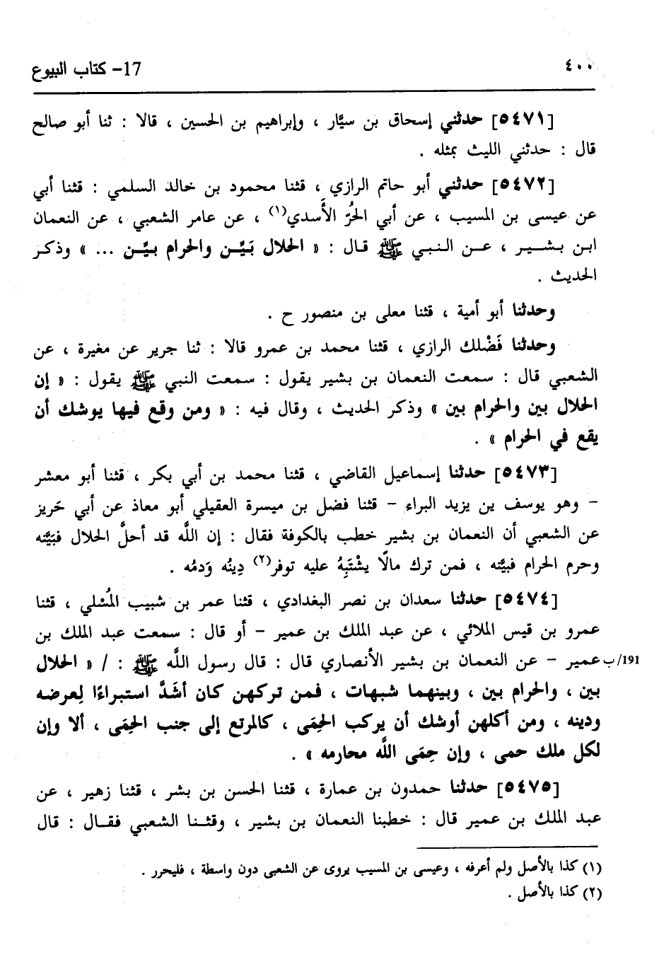 5472 - حَدَّثَنِي أَبُو حَاتِمٍ الرَّازِيُّ، قثنا مَحْمُودُ بْنُ خَالِدٍ السُّلَمِيُّ، قثنا أَبِي، عَنْ عِيسَى بْنِ الْمُسَيِّبِ، عَنْ أَبِي الْحَرِّ الْأَسَدِيِّ، عَنْ عَامِرٍ الشَّعْبِيِّ، عَنِ النُّعْمَانِ بْنِ بَشِيرٍ، عَنِ النَّبِيِّ صَلَّى اللهُ عَلَيْهِ وَسَلَّمَ قَالَ: «§الْحَلَالُ بَيِّنٌ وَالْحَرَامُ بَيِّنٌ» وَذَكَرَ الْحَدِيثَ، وَحَدَّثَنَا أَبُو أُمَيَّةَ، قثنا مُعَلَّى بْنُ مَنْصُورٍ ح وَحَدَّثَنَا فَضْلَكٌ الرَّازِيُّ، قثنا مُحَمَّدُ بْنُ عَمْرٍو، قَالَا: ثَنَا جَرِيرٌ عَنْ مُغِيرَةَ، عَنِ الشَّعْبِيِّ قَالَ: سَمِعْتُ النُّعْمَانَ بْنَ بَشِيرٍ يَقُولُ: سَمِعْتُ النَّبِيَّ صَلَّى اللهُ عَلَيْهِ وَسَلَّمَ يَقُولُ: «إِنَّ الْحَلَالَ بَيِّنٌ وَالْحَرَامَ بَيِّنٌ» وَذَكَرَ الْحَدِيثَ وَقَالَ فِيهِ: «وَمَنْ وَقَعَ فِيهَا يُوشِكُ أَنْ يَقَعَ فِي الْحَرَامِ»