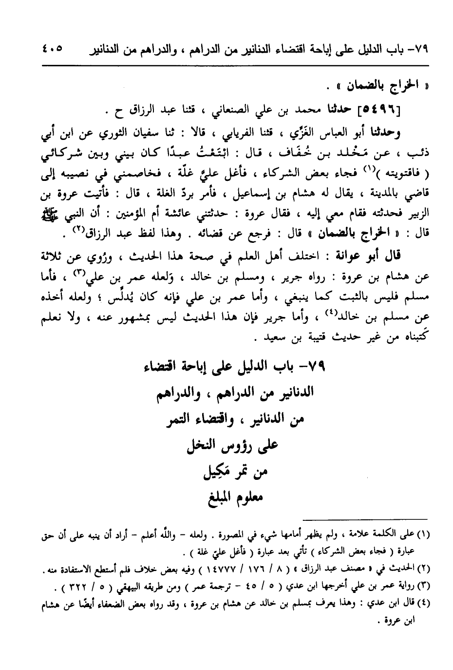 5496 - حَدَّثَنَا مُحَمَّدُ بْنُ عَلِيٍّ الصَّنْعَانِيُّ، قثنا عَبْدُ الرَّزَّاقِ، ح وَحَدَّثَنَا أَبُو الْعَبَّاسِ الْغَزِّيُّ، قثنا الْفِرْيَابِيُّ، قَالَا: ثَنَا سُفْيَانُ الثَّوْرِيُّ، عَنِ ابْنِ أَبِي ذِئْبٍ، عَنْ مَخْلَدِ بْنِ خَفَّافٍ، قَالَ: ابْتَعْتُ عَبْدًا كَانَ بَيْنِي وَبَيْنَ شُرَكَائِي، فَاقْتَوَيْتُهُ، فَجَاءَ بَعْضُ الشُّرَكَاءِ، فَأَغَلَّ عَلِيَّ غَلَّةً، فَخَاصَمَنِي فِي نَصِيبِهِ إِلَى قَاضٍ بِالْمَدِينَةِ يُقَالُ لَهُ هِشَامُ بْنُ إِسْمَاعِيلَ، فَأَمَرَ بِرَدِ الْغَلَّةِ قَالَ: فَأَتَيْتُ عُرْوَةَ بْنَ الزُّبَيْرِ فَحَدَّثْتُهُ، فَقَامَ مَعِي إِلَيْهِ، فَقَالَ عُرْوَةُ: حَدَّثَتْنِي عَائِشَةِ أُمُّ الْمُؤْمِنِينَ أَنَّ النَّبِيَّ صَلَّى اللهُ عَلَيْهِ وَسَلَّمَ قَالَ: «§الْخَرَاجُ بِالضَّمَانِ» ، قَالَ: فَرَجَعَ عَنْ قَضَائِهِ وَهَذَا لَفْظُ عَبْدِ الرَّزَّاقِ، قَالَ أَبُو عَوَانَةَ: «اخْتَلَفَ أَهْلُ الْعِلْمِ فِي صِحَّةِ هَذَا الْحَدِيثِ، وَرُوِيَ عَنْ ثَلَاثَةٍ عَنْ هِشَامِ بْنِ عُرْوَةَ رَوَاهُ جَرِيرٌ، وَمُسْلِمُ بْنُ خَالِدٍ، وَلَعَلَّهُ عُمَرُ بْنُ عَلِيٍّ فَأَمَّا مُسْلِمٌ فَلَيْسَ بِالثَّبْتِ كَمَا يَنْبَغِي، وَأَمَّا عُمَرُ بْنُ عَلِيٍّ فَإِنَّهُ كَانَ يُدَلِّسُ، وَلَعَلَّهُ أَخَذَهُ عَنْ مُسْلِمِ بْنِ خَالِدٍ، وَأَمَّا جَرِيرٌ فَإِنُّ هَذَا الْحَدِيثُ لَيْسَ بِمَشْهُورٍ عَنْهُ، وَلَا نَعْلَمُ كَتَبْنَاهُ مِنْ غَيْرِ حَدِيثِ قُتَيْبَةَ بْنِ سَعِيدٍ»