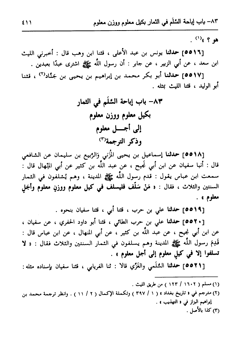 5521 - حَدَّثَنَا السُّلَمِيُّ، وَالْغَزِّيُّ، قَالَا: ثَنَا الْفِرْيَابِيُّ، قثنا سُفْيَانُ، بِإِسْنَادِهِ مِثْلَهُ -[412]-، فَقَالَ رَسُولُ اللَّهِ صَلَّى اللهُ عَلَيْهِ وَسَلَّمَ: «§لَا تُسْلِفُوا فِي الثِّمَارِ. . . فِي كَيْلٍ مَعْلُومٍ» رَوَاهُ وَكِيعٌ، وَعَبْدُ الرَّحْمَنِ بْنُ مَهْدِيٍّ، عَنْ سُفْيَانَ يَذْكُرَانِ فِيهِ إِلَى أَجَلٍ مَعْلُومٍ وَقَالَ عَبْدُ الرَّحْمَنِ: وَزْنٌ مَعْلُومٌ