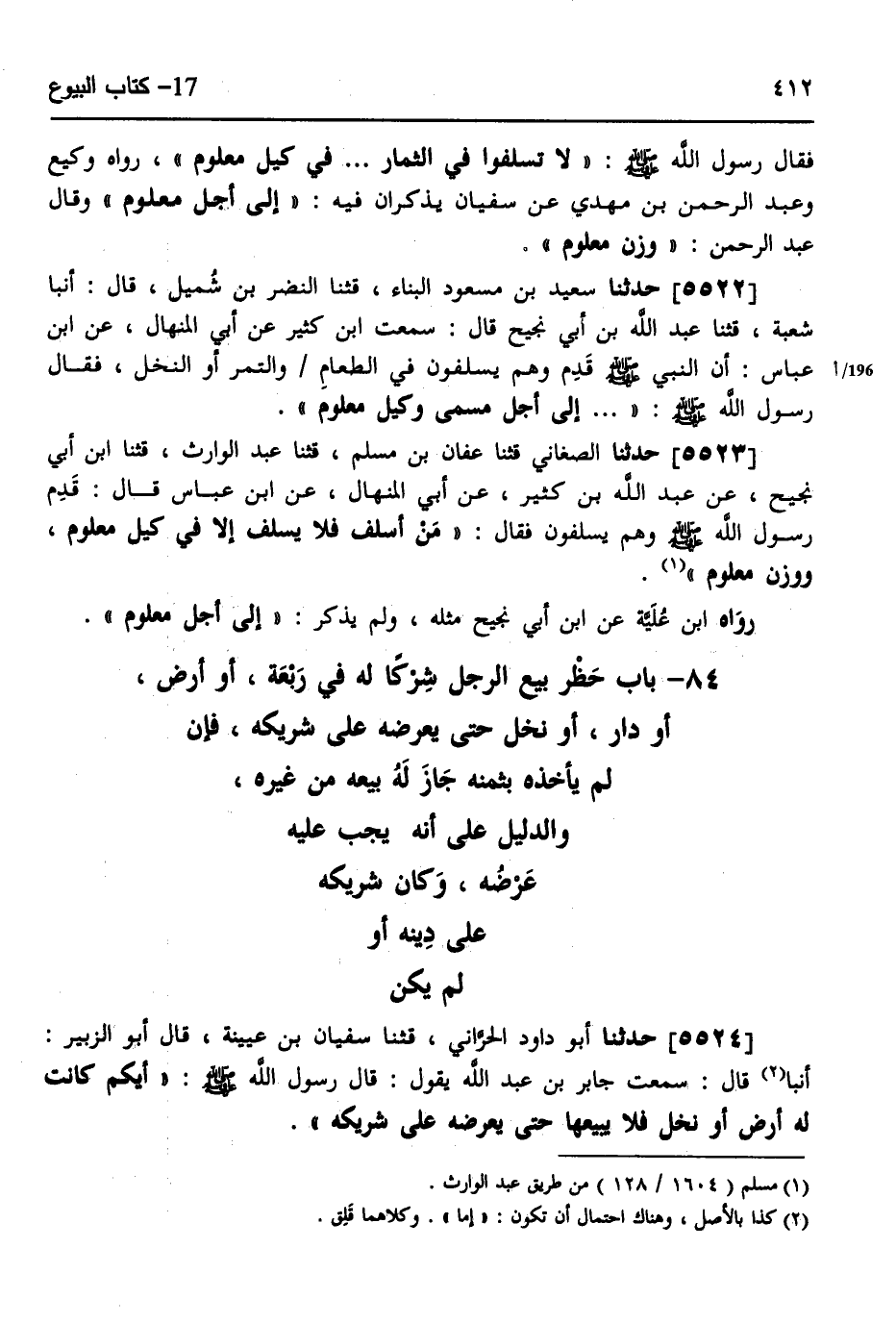 5523 - حَدَّثَنَا الصَّغَانِيُّ، قثنا عَفَّانُ بْنُ مُسْلِمٍ، قثنا عَبْدُ الْوَارِثِ، قثنا ابْنُ أَبِي نَجِيحٍ، عَنْ عَبْدِ اللَّهِ بْنِ كَثِيرٍ، عَنْ أَبِي الْمِنْهَالِ، عَنِ ابْنِ عَبَّاسٍ قَالَ: قَدِمَ رَسُولُ اللَّهِ صَلَّى اللهُ عَلَيْهِ وَسَلَّمَ وَهُمْ يُسْلِفُونَ، فَقَالَ: «§مَنْ أَسْلَفَ فَلَا يُسْلِفْ إِلَّا فِي كَيْلٍ مَعْلُومٍ وَوَزْنٍ مَعْلُومٍ» رَوَاهُ ابْنُ عُلَيَّةَ، عَنِ ابْنِ أَبِي نَجِيحٍ مِثْلَهُ وَلَمْ يَذْكُرْ إِلَى «أَجَلٍ مَعْلُومٍ»