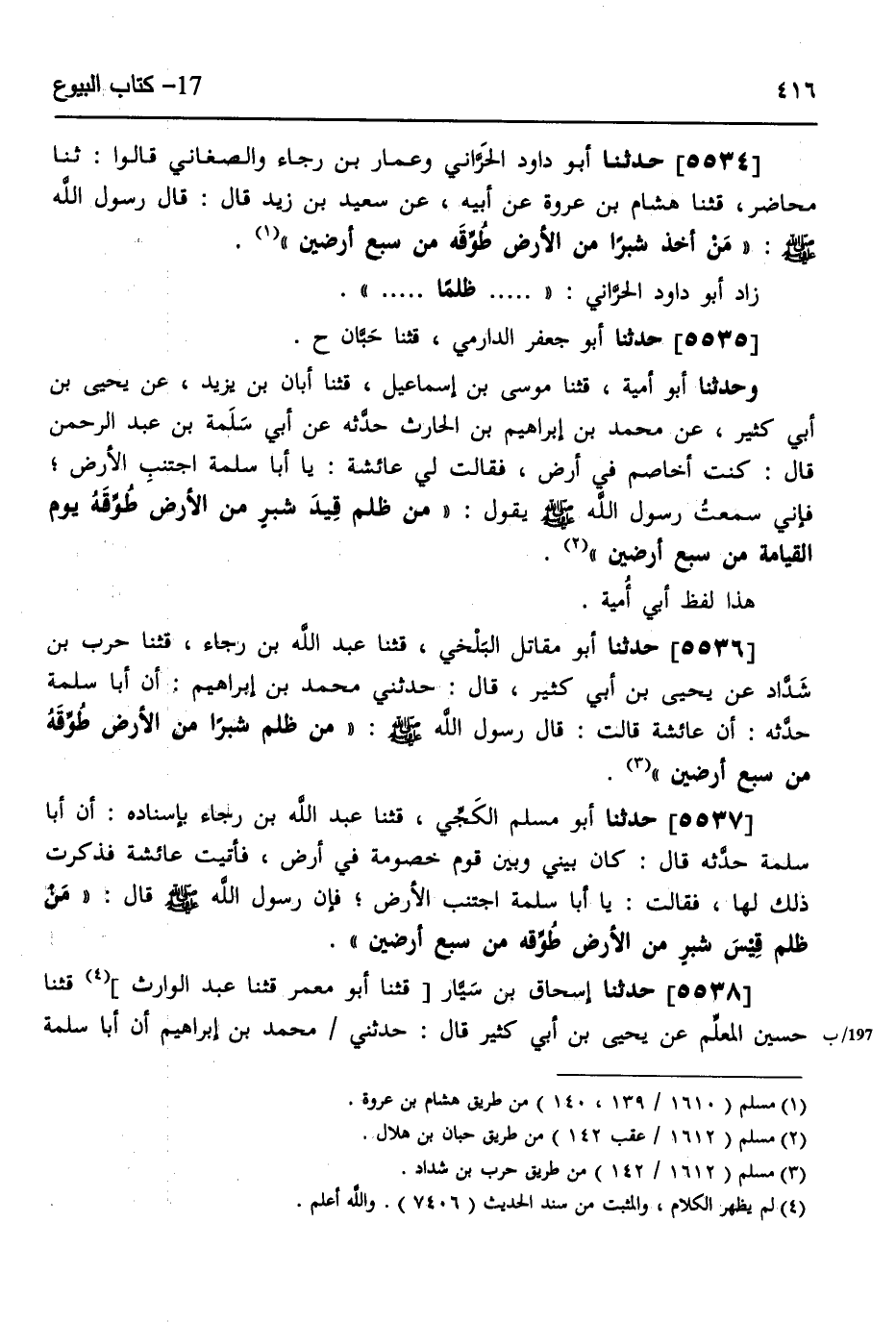 5534 - حَدَّثَنَا أَبُو دَاوُدَ الْحَرَّانِيُّ، وَعَمَّارُ بْنُ رَجَاءٍ، وَالصَّغَانِيُّ، قَالُوا: ثَنَا مُحَاضِرٌ، قثنا هِشَامُ بْنُ عُرْوَةَ، عَنْ أَبِيهِ، عَنْ سَعِيدِ بْنِ زَيْدٍ، قَالَ: قَالَ رَسُولُ اللَّهِ صَلَّى اللهُ عَلَيْهِ وَسَلَّمَ: «§مَنْ أَخَذَ شِبْرًا مِنَ الْأَرْضِ طُوِّقَهُ مِنْ سَبْعِ أَرَضِينَ» زَادَ أَبُو دَاوُدَ الْحَرَّانِيُّ «ظُلْمًا»