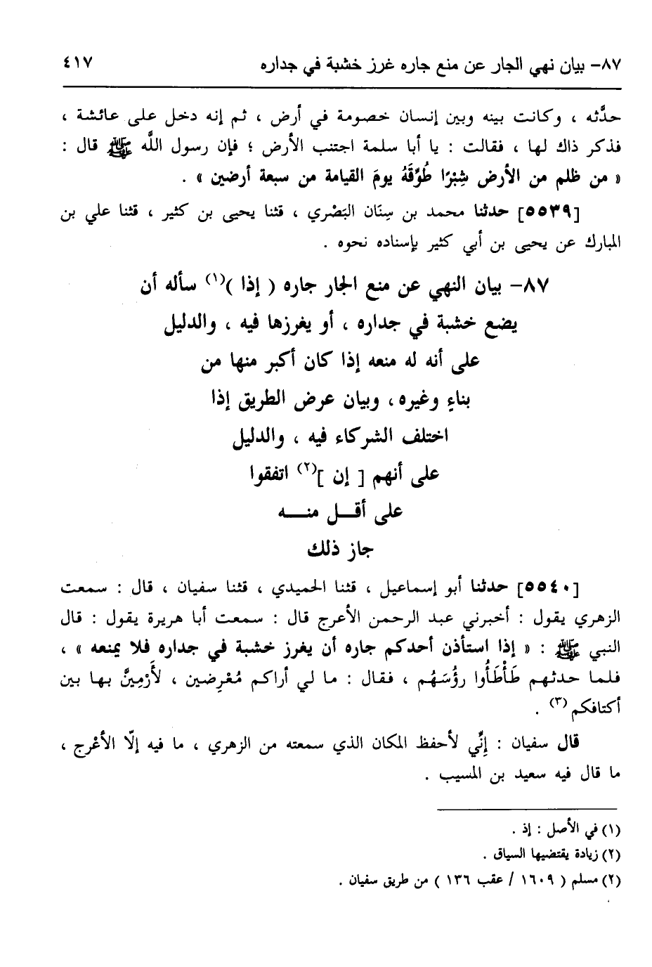 5540 - حَدَّثَنَا أَبُو إِسْمَاعِيلَ، قثنا الْحُمَيْدِيُّ، قثنا سُفْيَانُ، قَالَ: سَمِعْتُ الزُّهْرِيَّ، يَقُولُ: أَخْبَرَنِي عَبْدُ الرَّحْمَنِ الْأَعْرَجُ، قَالَ: سَمِعْتُ أَبَا هُرَيْرَةَ، يَقُولُ: قَالَ النَّبِيُّ صَلَّى اللهُ عَلَيْهِ وَسَلَّمَ: «§إِذَا اسْتَأْذَنَ أَحَدَكُمْ جَارُهُ أَنْ يَغْرِزَ خَشَبَةً فِي جِدَارِهِ، فَلَا يَمْنَعْهُ، فَلَمَّا حَدَّثَهُمْ طَأْطَئُوا رُءُوسَهُمْ» ، فَقَالَ: مَا لِي أَرَاكُمْ مُعْرِضِينَ؟ لَأَرْمِيَنَّ بِهَا بَيْنَ أَكْتَافِكُمْ، قَالَ سُفْيَانُ: إِنِّي لَأَحْفَظُ الْمَكَانَ الَّذِي سَمِعْتُهُ مِنَ الزُّهْرِيِّ مَا فِيهِ إِلَّا الْأَعْرَجُ مَا قَالَ فِيهِ: سَعِيدُ بْنُ الْمُسَيِّبِ "