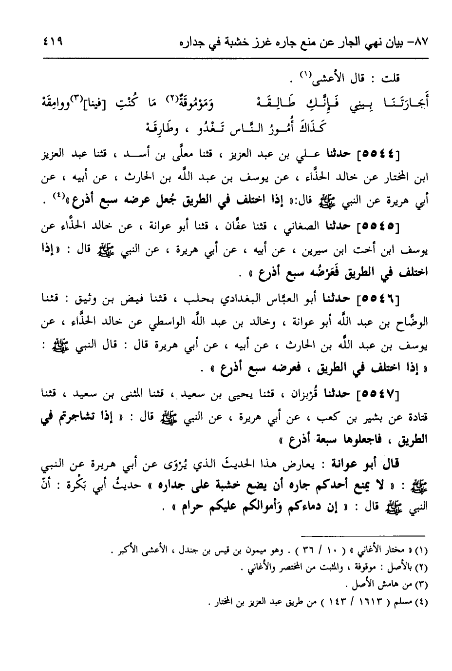 5547 - حَدَّثَنَا قُرْبَزَانُ، قثنا يَحْيَى بْنُ سَعِيدٍ، قثنا الْمُثَنَّى بْنُ سَعِيدٍ، قثنا قَتَادَةُ، عَنْ بَشِيرِ بْنِ كَعْبٍ، عَنْ أَبِي هُرَيْرَةَ، عَنِ النَّبِيِّ صَلَّى اللهُ عَلَيْهِ وَسَلَّمَ قَالَ: «§إِذَا تَشَاجَرْتُمْ فِي، الطَّرِيقِ فَاجْعَلُوهَا سَبْعَةَ أَذْرُعٍ» قَالَ أَبُو عَوَانَةَ: يُعَارَضُ هَذَا الْحَدِيثُ الَّذِي يُرْوَى عَنْ أَبِي هُرَيْرَةَ، عَنِ النَّبِيِّ صَلَّى اللهُ عَلَيْهِ وَسَلَّمَ «لَا يَمْنَعْ أَحَدُكُمْ جَارَهُ أَنْ يَضَعَ خَشَبَةً عَلَى جِدَارِهِ» حَدِيثُ أَبِي بَكْرَةَ أَنَّ النَّبِيَّ صَلَّى اللهُ عَلَيْهِ وَسَلَّمَ قَالَ: «إِنَّ دِمَاءَكُمْ، وَأَمْوَالَكُمْ عَلَيْكُمْ حَرَامٌ»