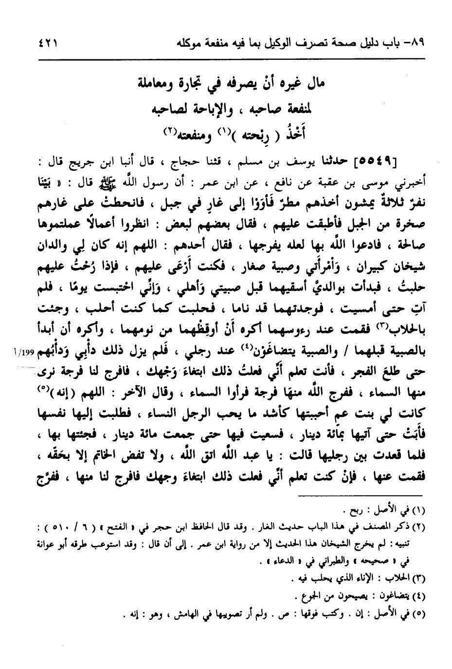 5549 - حَدَّثَنَا يُوسُفُ بْنُ مُسْلِمٍ، قثنا حَجَّاجٌ، قَالَ: أنبا ابْنُ جُرَيْجٍ، قَالَ: أَخْبَرَنِي مُوسَى بْنُ عُقْبَةَ، عَنْ نَافِعٍ، عَنِ ابْنِ عُمَرَ، أَنَّ رَسُولَ اللَّهِ صَلَّى اللهُ عَلَيْهِ وَسَلَّمَ قَالَ: " §بَيْنَا نَفَرٌ ثَلَاثَةٌ يَمْشُونَ أَخَذَهُمْ مَطَرٌ، فَأَوَوْا إِلَى غَارٍ فِي جَبَلٍ، فَانْحَطَّتْ عَلَى غَارِهِمْ صَخْرَةٌ مِنَ الْجَبَلِ، فَأَطْبَقَتْ عَلَيْهِمْ، فَقَالَ بَعْضُهُمْ لِبَعْضٍ: انْظُرُوا أَعْمَالًا عَمِلْتُمُوهَا صَالِحَةً، فَادْعُوا اللَّهَ بِهَا لَعَلَّهُ يُفَرِّجُهَا، فَقَالَ أَحَدُهُمْ: اللَّهُمَّ إِنَّهُ كَانَ لِي وَالِدِانِ شَيْخَانِ كَبِيرَانِ، وَامْرَأَتِي وَصِبْيَةٌ صِغَارٌ فَكُنْتُ أَرْعَى عَلَيْهِمْ، فَإِذَا رُحْتُ عَلَيْهِمْ حَلَبْتُ، فَبَدَأْتُ بِوَالِدَيَّ أَسْقِيهِمَا قَبْلَ صِبْيَتِي وَأَهِلِّي، وَإِنِّي أُحْتُبِسْتُ يَوْمًا فَلَمْ آتِ حَتَّى أَمْسَيْتُ، فَوَجَدْتُهُمَا قَدْ نَامَا، فَحَلَبْتُ كَمَا كُنْتُ أَحْلُبُ، وَجِئْتُ بِالْحِلَابِ، فَقُمْتُ عِنْدَ رُءُوسِهِمَا أَكْرَهُ أَنْ أُوقِظَهُمَا مِنْ نَوْمِهِمَا، وَأَكْرَهُ أَنْ أَبْدَأَ بِالصِّبْيَةِ قَبْلَهُمَا وَالصِّبْيَةُ يَتَضَاغَوْنَ عِنْدَ رِجْلَيَّ، فَلَمْ يَزَلْ ذَلِكَ دَأْبِي، وَدَأْبَهُمْ، حَتَّى طَلَعَ الْفَجْرُ، فَأَنْتَ تَعْلَمُ أَنِّي فَعَلْتُ ذَلِكَ ابْتِغَاءَ وَجْهِكَ، فَافْرُجْ لَنَا فُرْجَةً نَرَى مِنْهَا السَّمَاءَ، فَفَرَجَ اللَّهُ مِنْهَا فُرْجَةً فَرَأَوُا السَّمَاءَ، وَقَالَ الْآخَرُ: اللَّهُمَّ إِنَّهُ كَانَتْ لِي بِنْتُ عَمٍّ أَحْبَبْتُهَا كَأَشَدِّ مَا يُحِبُّ الرَّجُلُ النِّسَاءَ، فَطَلَبْتُ إِلَيْهَا نَفْسَهَا، فَأَبَتْ حَتَّى آتِيَهَا بِمِائَةِ دِينَارٍ، فَسَعَيْتُ فِيهَا، حَتَّى جَمَعْتُ مِائَةَ دِينَارٍ، فَجِئْتُهَا بِهَا فَلَمَّا قَعَدْتُ بَيْنَ رِجْلَيْهَا قَالَتْ: يَا عَبْدَ اللَّهِ اتَّقِ اللَّهَ، وَلَا تَفُضَّ الْخَاتَمَ إِلَّا بِحَقِّهِ، فَقُمْتُ عَنْهَا فَإِنْ كُنْتَ تَعْلَمُ أَنِّي فَعَلْتُ ذَلِكَ ابْتِغَاءَ وَجْهِكَ، فَافْرُجْ لَنَا مِنْهَا فَفَرَجَ -[422]- اللَّهُ لَهُمْ فُرْجَةً، وَقَالَ الْآخَرُ: اللَّهُمَّ إِنِّي كُنْتَ تَعْلَمُ أَنِّي كُنْتُ اسْتَأْجَرْتُ أَجِيرًا بِفَرَقِ رُزٍّ فَلَمَّا قَضَى عَمَلَهُ، قَالَ: أَعْطِنِي حَقِّي فَعَرَضْتُ عَلَيْهِ فَرَقَهُ، فَتَرَكَ وَرَغِبَ عَنْهُ فَلَمْ أَزَلْ أَزْرَعُهُ حَتَّى جَمَعْتُ مِنْهُ بَقَرًا وَرَاعِيَهَا، ثُمَّ جَاءَنِي، فَقَالَ: يَا عَبْدَ اللَّهِ لَا تَظْلِمْنِي وَأَعْطِنِي حَقِّي، فَقُلْتُ: اذْهَبْ إِلَى تِلْكَ الْبَقَرِ وَرَاعِيهَا، قَالَ: اتَّقِ اللَّهَ وَلَا تَهْزَأْ بِي، فَقُلْتُ لَهُ: إِنِّي لَا أَهْزَأُ بِكَ خُذْ تِلْكَ الْبَقَرَ وَرَاعِيَهَا فَأَخَذَهَا، فَقَالَ: أَتَهْزَأُ بِي فَقُلْتُ: اذْهَبْ فَخُذْهَا فَذَهَبَ بِهَا، فَإِنْ كُنْتَ تَعْلَمُ أَنِّي فَعَلْتُ ذَلِكَ ابْتِغَاءَ وَجْهِكَ، فَافْرُجْ لَنَا فَفَرَجَ اللَّهُ عَنْهُمْ "،