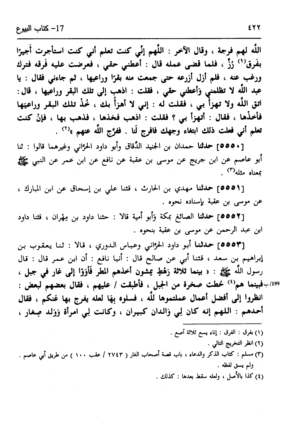 5553 - حَدَّثَنَا أَبُو دَاوُدَ الْحَرَّانِيُّ، وَعَبَّاسٌ الدُّورِيُّ، قَالَا: ثَنَا يَعْقُوبُ بْنُ إِبْرَاهِيمَ بْنِ سَعْدٍ، قثنا أَبِي، عَنْ صَالِحٍ، قَالَ: أنبا نَافِعٌ، أَنَّ ابْنَ عُمَرَ، قَالَ: قَالَ رَسُولُ اللَّهِ صَلَّى اللهُ عَلَيْهِ وَسَلَّمَ: " §بَيْنَمَا ثَلَاثَةُ رَهْطٍ يَمْشُونَ أَخَذَهُمُ الْمَطَرُ، فَأَوَوْا إِلَى غَارٍ فِي جَبَلٍ، فَبَيْنَمَا هُمْ حُطَّتْ صَخْرَةٌ مِنَ الْجَبَلِ، فَأَطْبَقَتْ عَلَيْهِمْ، فَقَالَ بَعْضُهُمْ لِبَعْضٍ: انْظُرُوا إِلَى أَفْضَلِ أَعْمَالٍ عَمِلْتُمُوهَا لِلَّهِ، فَسَلُوهُ بِهَا لَعَلَّهُ يُفَرِّجُ بِهَا عَنْكُمْ، فَقَالَ أَحَدُهُمْ: اللَّهُمَّ إِنَّهُ كَانَ لِي وَالِدَانِ كَبِيرَانِ، وَكَانَتْ لِي امْرَأَةٌ وَوَلَدٌ صِغَارٌ -[423]-، فَكُنْتُ أَرْعَى عَلَيْهِمْ، فَإِذَا رُحْتُ عَلَيْهِمْ غَنَمِي بَدَأْتُ بِأَبَوَيَّ، فَسَقَيْتُهُمَا فَنَأَى يَوْمًا الشَّجَرُ، فَلَمْ آتِ حَتَّى نَامَ أَبَوَايَ، فَطَيَّبَتِ الْإِنَاءَ، ثُمَّ حَلَبْتُ، ثُمَّ قُمْتُ بِحِلَابِي عِنْدَ رَأْسِ أَبَوَيَّ وَالصِّبْيَةُ يَتَضَاغَوْنَ عِنْدَ رِجْلَيَّ أَكْرَهُ أَنْ أَبْدَأَ بِهِمْ قَبْلَ أَبَوَيَّ، وَأَكْرَهُ أَنْ أُوقِظَهُمَا مِنْ نَوْمِهِمَا، فَلَمْ أَزَلْ كَذَلِكَ قَائِمًا، حَتَّى أَضَاءَ الْفَجْرُ اللَّهُمَّ إِنْ كُنْتَ تَعْلَمُ أَنِّي فَعَلْتُ ذَلِكَ ابْتِغَاءَ وَجْهِكَ، فَافْرُجْ عَنَّا فُرْجَةً نَرَى مِنْهَا السَّمَاءَ، فَفَرَجَ لَهُمْ فُرْجَةً، فَرَأَوْا مِنْهَا السَّمَاءَ، وَقَالَ الْآخَرُ: اللَّهُمَّ إِنَّهَا كَانَتْ لِي ابْنَةُ عَمٍّ، فَأَحْبَبْتُهَا حَتَّى كَانَتْ أَحَبَّ النَّاسِ إِلَيَّ، فَسَأَلْتُهَا نَفْسَهَا فَقَالَتْ: لَا حَتَّى تَأْتِيَنِي بِمِائَةِ دِينَارٍ، فَسَعَيْتُ حَتَّى جَمَعْتُ مِائَةَ دِينَارٍ فَأَتَيْتُهَا بِهَا، فَلَمَّا كُنْتُ عِنْدَ رِجْلَيْهَا، فَقَالَتِ: اتَّقِ اللَّهَ وَلَا تَفْتَحِ الْخَاتَمَ إِلَّا بِحَقِّهِ، فَقُمْتُ عَنْهَا اللَّهُمَّ إِنْ كُنْتَ تَعْلَمُ أَنِّي فَعَلْتُ ذَلِكَ ابْتِغَاءَ وَجْهِكَ، فَافْرُجْ لَنَا مِنْهَا فُرْجَةً، فَفَرَجَ لَهُمْ مِنْهَا فُرْجَةً، وَقَالَ الثَّالِثُ: اللَّهُمَّ إِنِّي كُنْتُ اسْتَأْجَرْتُ أَجِيرًا بِفَرَقِ ذُرَةٍ، فَلَمَّا قَضَى عَمَلَهُ عَرَضْتُهُ عَلَيْهِ فَأَبَى أَنْ يَأْخُذَهُ وَرَغِبَ عَنْهُ، فَلَمْ أَزَلْ أَعْتَمِلُ بِهِ حَتَّى جَمَعْتُ مِنْهُ بَقَرًا وَرِعَاءَهَا، فَجَاءَنِي فَقَالَ: اتَّقِ اللَّهَ وَأَعْطِنِي حَقِّي وَلَا تَظْلِمْنِي، فَقُلْتُ لَهُ: اذْهَبْ إِلَى تِلْكَ الْبَقَرِ وَرُعَاتِهَا فَخُذْهَا، فَذَهَبَ فَاسْتَاقَهَا اللَّهُمَّ إِنْ كُنْتَ تَعْلَمُ أَنِّي فَعَلْتُ ذَلِكَ ابْتِغَاءَ وَجْهِكَ، فَافْرُجْ عَنَّا مَا بَقِيَ مِنْهَا فَفَرَجَ اللَّهُ عَنْهُمْ فَخَرَجُوا يَتَمَاشَوْنَ "،