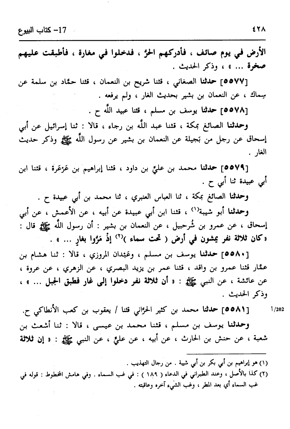 5581 - حَدَّثَنَا مُحَمَّدُ بْنُ كَثِيرٍ الْحَرَّانِيُّ، قثنا يَعْقُوبُ بْنُ كَعْبٍ الْأَنْطَاكِيُّ، ح وَحَدَّثَنَا يُوسُفُ بْنُ مُسْلِمٍ، قثنا مُحَمَّدُ بْنُ عِيسَى، قَالَا: ثَنَا أَشْعَثُ بْنُ شُعْبَةَ، عَنْ حَنَشِ بْنِ الْحَارِثِ، عَنْ أَبِيهِ، عَنْ عَلِيٍّ، عَنِ النَّبِيِّ صَلَّى اللهُ عَلَيْهِ وَسَلَّمَ أَنَّ " §ثَلَاثَةَ -[429]- نَفَرٍ انْطَلِقُوا إِلَى حَاجَاتِهِمْ، فَأَوَاهُمُ اللَّيْلُ إِلَى كَهْفٍ، فَانْطَبَقَ عَلَيْهِمْ، فَقَالُوا: يَا هَؤُلَاءِ، تَذَاكَرُوا حُسْنَ أَعْمَالِكُمْ، فَادْعُوا اللَّهَ بِهَا لَعَلَّ اللَّهَ أَنْ يُفَرِّجَ عَنْكُمْ " وَذَكَرَ الْحَدِيثَ،
