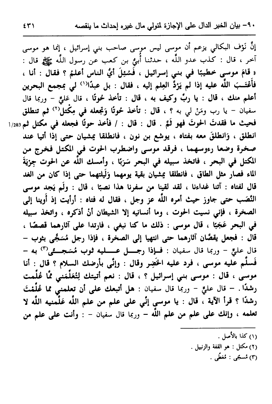 5590- حَدَّثَنَا سُلَيْمَانُ بْنُ سَيْفٍ الْحَرَّانِيُّ ، قَالَ : حَدَّثَنَا عَلِيُّ بْنُ الْمَدِينِيِّ ، قَالَ : حَدَّثَنَا سُفْيَانُ ، قَالَ : حَدَّثَنَا عَمْرُو بْنُ دِينَارٍ ، قَالَ : حَدَّثَنِي سَعِيدُ بْنُ جُبَيْرٍ ، قَالَ : قُلْتُ لابْنِ عَبَّاسٍ : إِنَّ نَوْف الْبِكَالِيَّ يَزْعُمُ أَنَّ مُوسَى لَيْسَ مُوسَى صَاحِبَ بَنِي إِسْرَائِيلَ ، إِنَّمَا هُوَ مُوسَى آخَرُ ، قَالَ : كَذَبَ عَدُوُّ اللهِ , حَدَّثَنَا أُبَيُّ بْنُ كَعْبٍ ، عَنْ رَسُولِ اللهِ صَلَّى الله عَلَيهِ وسَلَّم ، قَالَ : قَامَ مُوسَى خَطِيبًا فِي بَنِي إِسْرَائِيلَ ، فَسُئِلَ أَيُّ النَّاسِ أَعْلَمُ ؟ فَقَالَ : أَنَا ، فَأَعْتَبَ اللَّهُ عَلَيْهِ إِذَا لَمْ يَرُدَّ الْعِلْمَ إِلَيْهِ ، فَقَالَ : بَلْ عَبْدًا لِي بِمَجْمَعِ الْبَحْرَيْنِ أَعْلَمُ مِنْكَ ، قَالَ : يَا رَبِّ ، وَكَيْفَ بِهِ ؟ قَالَ : تَأْخُذُ حُوتًا قَالَ عَلِيٌّ : وَرُبَّمَا قَالَ سُفْيَانُ : يَا رَبِّ وَمَنْ لِي بِهِ ؟ قَالَ : تَأْخُذُ حُوتًا وَتَجْعَلُهُ فِي مِكْتَلٍ ، ثُمَّ تَنْطَلِقُ ، فَحَيْثُ مَا فَقَدْتَ الْحُوتَ فَهُوَ ثَمَّ ، قَالَ : قَالَ فَأَخَذَ حُوتًا فَجَعَلَهُ فِي مِكْتَلٍ ، ثُمَّ انْطَلَقَ ، وَانْطَلَقَ مَعَهُ بِفَتَاهُ يُوشَعَ بْنِ نُونٍ ، فَانْطَلَقَا يَمْشِيَانِ حَتَّى إِذَا أَتَيَا عِنْدَ صَخْرَةٍ وَضَعَا رُؤُوسَهُمَا ، فَرْقَدَ مُوسَى ، وَاضْطَرَبَ الْحُوتُ فِي الْمِكْتَلِ ، فَخَرَجَ مِنَ الْمِكْتَلِ فِي الْبَحْرِ ، فَاتَّخَذَ سَبِيلَهُ فِيِ الْبَحْرِ سَرَبًا ، وَأَمْسَكَ اللَّهُ عَنِ الْحُوتِ جِرْيَةَ الْمَاءَ ، فَصَارَ مِثْلَ الطَّاقِ ، فَانْطَلَقَا يَمْشِيَانِ بَقِيَّةَ يَوْمَهُمَا وَلَيْلَتَهُمَا ، حَتَّى إِذَا كَانَ مِنَ الْغَدِ قَالَ لِفَتَاهُ : آتِنَا غَدَاءَنَا ، لَقَدْ لَقِينَا مِنْ سَفَرِنَا هَذَا نَصَبًا ، قَالَ : وَلَمْ يَجِدْ مُوسَى النَّصَبَ ، حَتَّى جَاوَزَ حَيْثُ أَمَرَهُ اللَّهُ عَزَّ وَجَلَّ ، فَقَالَ لَهُ فَتَاهُ : أَرَأَيْتَ إِذْ أَوَيْنَا إِلَى الصَّخْرَةِ ، فَإِنِّي نَسِيتُ الْحُوتَ ، وَمَا أَنْسَانِيهِ إِلا الشَّيْطَانُ أَنْ أَذْكُرَهُ ، وَاتَّخَذَ سَبِيلَهُ فِي الْبَحْرِ عَجَبًا ، قَالَ مُوسَى : ذَلِكَ مَا كُنَّا نَبْغِي ، فَارْتَدَّا عَلَى آثَارِهِمَا قَصَصًا ، قَالَ : فَجَعَلَ يَقُصَّانِ آثَارَهُمَا حَتَّى انْتَهَيَا إِلَى الصَّخْرَةِ ، فَإِذَا رَجُلٌ مُسَجًّى بِثَوْبٍ قَالَ عَلِيٌّ : وَرُبَّمَا قَالَ سُفْيَانُ : فَإِذَا رَجُلٌ عَلَيْهِ ثَوْبٌ مُسَجًّى بِهِ ، فَسَلَّمَ عَلَيْهِ مُوسَى فَرَدَّ عَلَيْهِ الْخَضِرُ وَقَالَ : وَأَنَّى بِأَرْضِكَ السَّلامُ ؟(1),