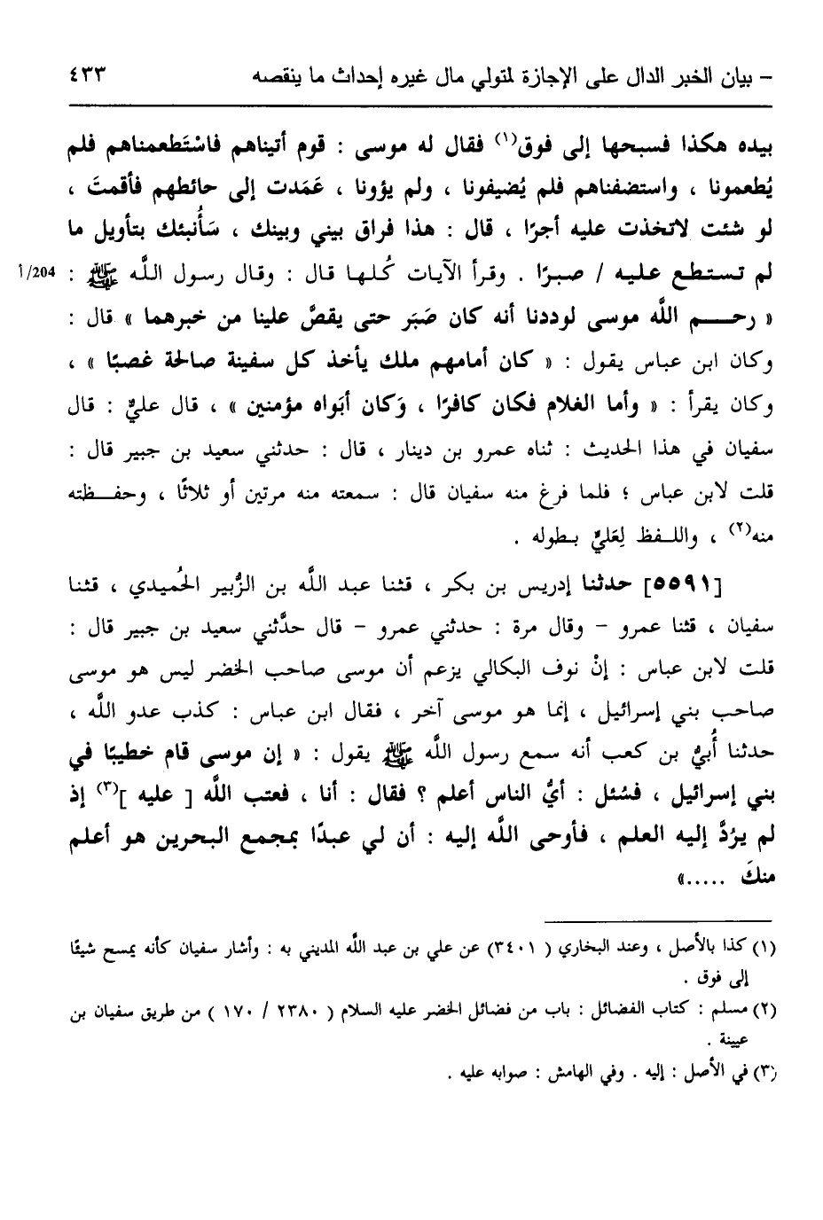 5591 - حَدَّثَنَا إِدْرِيسُ بْنُ بَكْرٍ، قثنا عَبْدُ اللَّهِ بْنُ الزُّبَيْرِ الْحُمَيْدِيُّ، قثنا سُفْيَانُ، قثنا عَمْرٌو، وَقَالَ مَرَّةً حَدَّثَنِي عَمْرٌو، قَالَ: حَدَّثَنِي سَعِيدُ بْنُ جُبَيْرٍ، قَالَ: قُلْتُ لِابْنِ عَبَّاسٍ إِنَّ نَوْفًا الْبِكَالِيَّ يَزْعُمُ أَنَّ مُوسَى صَاحِبَ الْخَضِرَ لَيْسَ هُوَ مُوسَى صَاحِبَ بَنِي إِسْرَائِيلَ إِنَّمَا هُوَ مُوسَى آخَرُ، فَقَالَ ابْنُ عَبَّاسٍ: كَذَبَ عَدُوُّ اللَّهِ حَدَّثَنَا أُبَيُّ بْنُ كَعْبٍ أَنَّهُ سَمِعَ رَسُولَ اللَّهِ صَلَّى اللهُ عَلَيْهِ وَسَلَّمَ يَقُولُ: " إِنَّ §مُوسَى قَامَ خَطِيبًا فِي بَنِي إِسْرَائِيلَ فَسُئِلَ أَيُّ النَّاسِ أَعْلَمُ؟ فَقَالَ: أَنَا فَعَتَبَ اللَّهُ عَلَيْهِ، إِذْ لَمْ يَرُدَّ إِلَيْهِ الْعِلْمَ، فَأَوْحَى اللَّهُ إِلَيْهِ أَنَّ لِي عَبْدًا بِمَجْمَعِ الْبَحْرَيْنِ هُوَ أَعْلَمُ مِنْكَ " -[434]-،