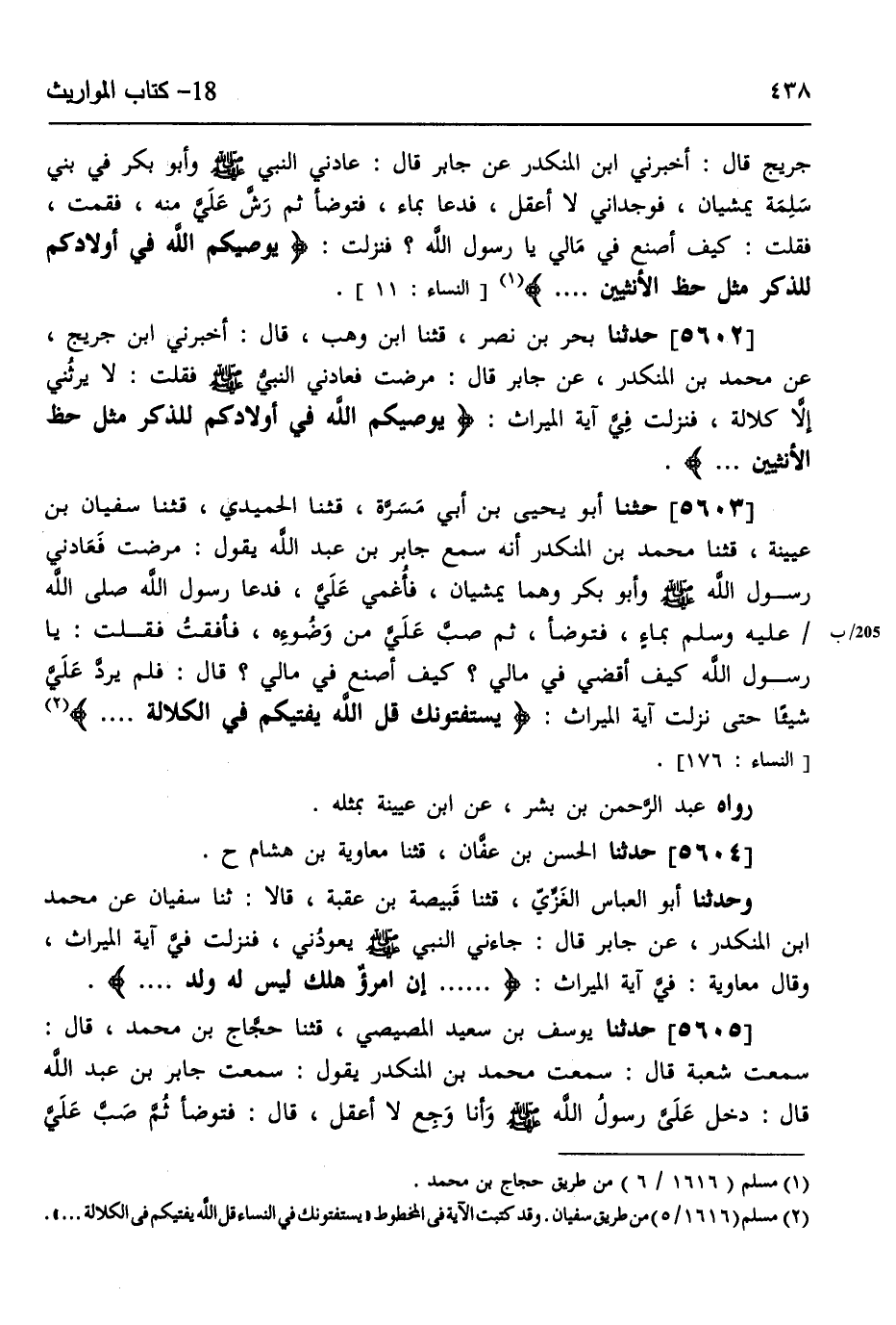 5603 - حَثَنَا أَبُو يَحْيَى بْنُ أَبِي مَسَرَّةَ، قثنا الْحُمَيْدِيُّ، قثنا سُفْيَانُ بْنُ عُيَيْنَةَ، قثنا مُحَمَّدُ بْنُ الْمُنْكَدِرِ، أَنَّهُ سَمِعَ جَابِرَ بْنَ عَبْدِ اللَّهِ، يَقُولُ: مَرِضْتُ، فَعَادَنِي رَسُولُ اللَّهِ صَلَّى اللهُ عَلَيْهِ وَسَلَّمَ وَأَبُو بَكْرٍ، وَهُمَا يَمْشِيَانِ فَأُغْمِيَ عَلَيَّ، فَدَعَا رَسُولُ اللَّهِ صَلَّى اللهُ عَلَيْهِ وَسَلَّمَ بِمَاءٍ، فَتَوَضَّأَ، ثُمَّ صَبَّ عَلِيَّ مِنْ وَضُوئِهِ، فَأَفَقْتُ فَقُلْتُ: يَا رَسُولَ اللَّهِ، كَيْفَ أَقْضِي فِي مَالِي؟ كَيْفَ أَصْنَعُ فِي مَالِي؟ قَالَ: فَلَمْ يَرُدَّ عَلِيَّ شَيْئًا، حَتَّى نَزَلَتْ آيَةُ الْمِيرَاثِ " {§يَسْتَفْتُونَكَ قُلِ اللَّهُ يُفْتِيكُمْ فِي الْكَلَالَةِ} [النساء: 176] " رَوَاهُ عَبْدُ الرَّحْمَنِ بْنُ بِشْرٍ، عَنِ ابْنِ عُيَيْنَةَ، بِمِثْلِهِ