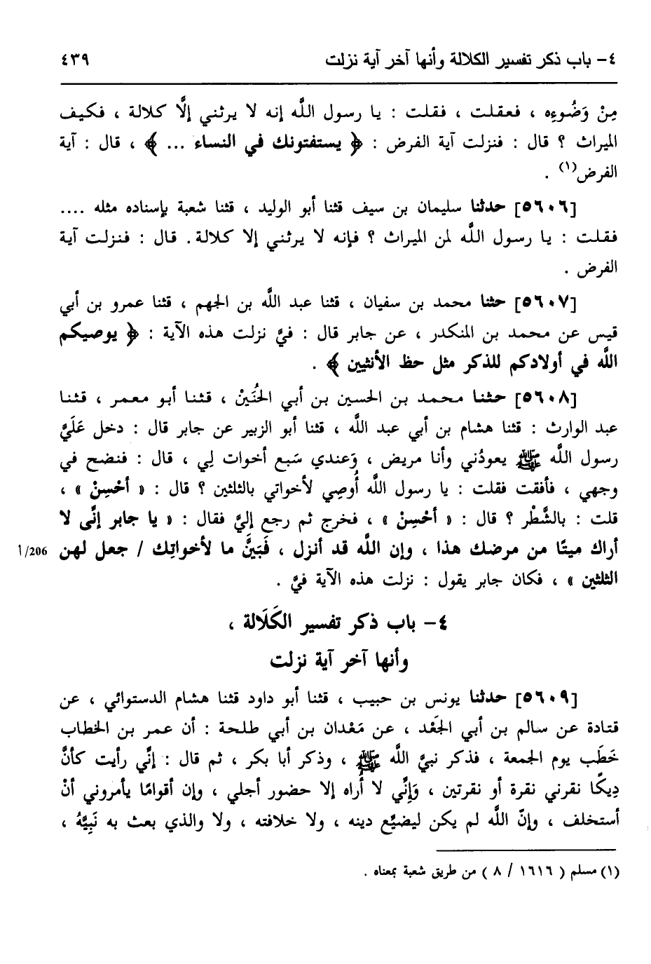 §بَابُ ذِكْرِ تَفْسِيرِ الْكَلَالَةِ وَأَنَّهَا آخِرُ آيَةٍ نَزَلَتْ "