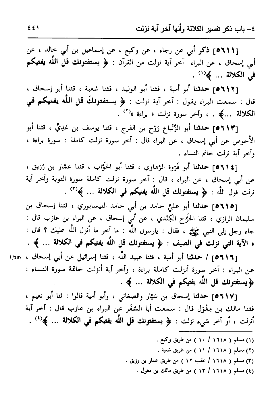 5617 - حَدَّثَنَا إِسْحَاقُ بْنُ سَيَّارٍ، وَالصَّغَانِيُّ، وَأَبُو أُمَيَّةَ قَالُوا: ثَنَا أَبُو نُعَيْمٍ، قثنا مَالِكُ بْنُ مِغْوَلٍ، قَالَ: سَمِعْتُ أَبَا السَّفَرِ، عَنِ الْبَرَاءِ بْنِ عَازِبٍ، قَالَ: " §آخِرُ آيَةٍ أُنْزِلَتْ، أَوْ آخِرُ شَيْءٍ نَزَلَتْ {يَسْتَفْتُونَكَ قُلِ اللَّهُ يُفْتِيكُمْ فِي الْكَلَالَةِ} [النساء: 176] "