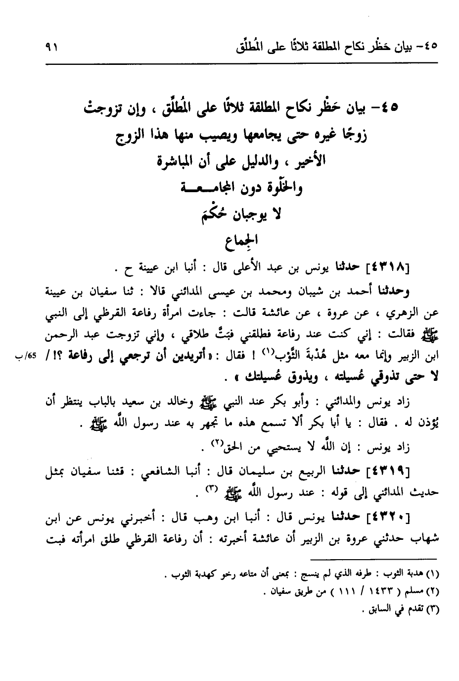 4318 - حَدَّثَنَا يُونُسُ بْنُ عَبْدِ الْأَعْلَى، قَالَ: أنبا ابْنُ عُيَيْنَةَ، ح وَحَدَّثَنَا أَحْمَدُ بْنُ شَيْبَانَ، وَمُحَمَّدُ بْنُ عِيسَى الْمَدَائِنِيُّ، قَالَا: ثَنَا سُفْيَانُ بْنُ عُيَيْنَةَ، عَنِ الزُّهْرِيِّ، عَنْ عُرْوَةَ، عَنْ عَائِشَةَ، قَالَتْ: جَاءَتِ امْرَأَةُ رِفَاعَةَ الْقُرَظِيِّ إِلَى النَّبِيِّ صَلَّى اللهُ عَلَيْهِ وَسَلَّمَ فَقَالَتْ: إِنِّي " §كُنْتُ عِنْدَ رِفَاعَةَ، فَطَلَّقَنِي فَبَتَّ طَلَاقِي، وَإِنِّي تَزَوَّجْتُ عَبْدَ الرَّحْمَنِ بْنَ الزُّبَيْرِ، وَإِنَّمَا مَعَهُ مِثْلُ هُدْبَةِ الثَّوْبِ، فَقَالَ: «أَتُرِيدِينَ أَنْ تَرْجِعِي إِلَى رِفَاعَةَ؟ لَا حَتَّى تَذُوقِي عُسَيْلَتَهُ وَيَذُوقَ عُسَيْلَتَكِ» زَادَ يُونُسُ وَالْمَدَائِنِيُّ وَأَبُو بَكْرٍ عِنْدَ النَّبِيِّ صَلَّى اللهُ عَلَيْهِ وَسَلَّمَ وَخَالِدُ بْنُ سَعِيدٍ بِالْبَابِ يَنْتَظِرُ أَنْ يُؤْذَنَ لَهُ فَقَالَ: يَا أَبَا بَكْرٍ، أَلَا تَسْمَعُ هَذِهِ مَا تَجْهَرُ بِهِ عِنْدَ رَسُولِ اللَّهِ صَلَّى اللهُ عَلَيْهِ وَسَلَّمَ زَادَ يُونُسُ، إِنَّ اللَّهَ لَا يَسْتَحْيِي مِنَ الْحَقِّ،