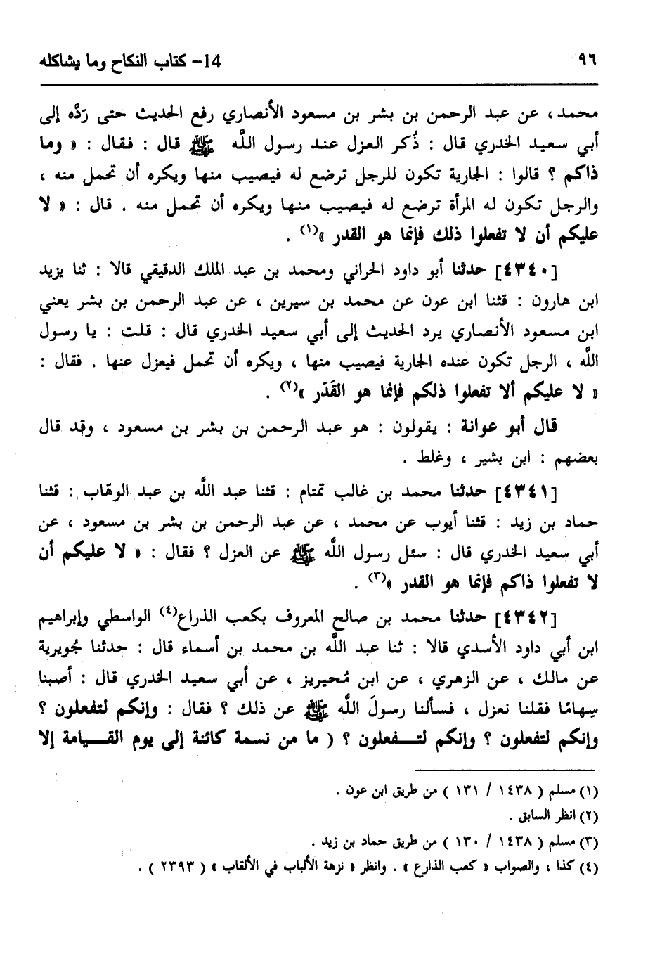 4340 - حَدَّثَنَا أَبُو دَاوُدَ الْحَرَّانِيُّ، وَمُحَمَّدُ بْنُ عَبْدِ الْمَلِكِ الدَّقِيقِيُّ، قَالَا: ثَنَا يَزِيدُ بْنُ هَارُونَ، قَثَنَا ابْنُ عَوْنٍ، عَنْ مُحَمَّدِ بْنِ سِيرِينَ، عَنْ عَبْدِ الرَّحْمَنِ بْنِ بِشْرٍ يَعْنِي ابْنَ مَسْعُودٍ الْأَنْصَارِيَّ، يَرُدُّ الْحَدِيثَ إِلَى أَبِي سَعِيدٍ الْخُدْرِيِّ قَالَ: قُلْتُ: يَا رَسُولَ اللَّهِ، الرَّجُلُ تَكُونُ عِنْدَهُ الْجَارِيَةُ، فَيُصِيبُ مِنْهَا وَيَكْرَهُ أَنْ تَحْمِلَ، فَيَعْزِلُ عَنْهَا، فَقَالَ: «§لَا عَلَيْكُمْ أَلَا تَفْعَلُوا ذَلِكُمْ، فَإِنَّمَا هُوَ الْقَدْرُ» ، قَالَ أَبُو عَوَانَةَ: يَقُولُونَ: هُوَ عَبْدُ الرَّحْمَنِ بْنُ بِشْرِ بْنِ مَسْعُودٍ، وَقَدْ قَالَ بَعْضُهُمْ: ابْنُ بَشِيرٍ وَغَلَطَ