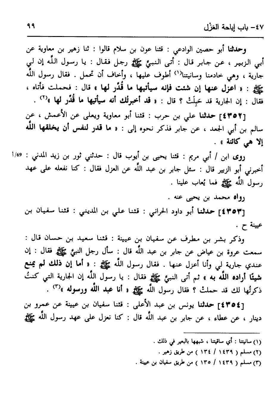 4353 - حَدَّثَنَا أَبُو دَاوُدَ الْحَرَّانِيُّ، قَثَنَا عَلِيُّ بْنُ الْمَدِينِيِّ، قَثَنَا سُفْيَانُ بْنُ عُيَيْنَةَ، ح وَذَكَرَ بِشْرَ بْنَ مُطَرِّفٍ، عَنْ سُفْيَانَ بْنِ عُيَيْنَةَ، قَثَنَا سَعِيدُ بْنُ حَسَّانَ، قَالَ: سَمِعْتُ عُرْوَةَ بْنَ عِيَاضٍ، عَنْ جَابِرِ بْنِ عَبْدِ اللَّهِ، قَالَ: سَأَلَ رَجُلٌ النَّبِيَّ صَلَّى اللهُ عَلَيْهِ وَسَلَّمَ، فَقَالَ: إِنَّ عِنْدِي جَارِيَةً لِي، وَأَنَا أَعْزِلُ عَنْهَا، فَقَالَ رَسُولُ اللَّهِ صَلَّى اللهُ عَلَيْهِ وَسَلَّمَ: «أَمَا إِنَّ ذَلِكَ لَمْ يَمْنَعْ شَيْئًا أَرَادَهُ اللَّهُ بِهِ» ، ثُمَّ أَتَى النَّبِيَّ صَلَّى اللهُ عَلَيْهِ وَسَلَّمَ، فَقَالَ: يَا رَسُولَ اللَّهِ، إِنَّ الْجَارِيَةَ الَّتِي كُنْتُ ذَكَرْتُهَا لَكَ قَدْ حَمَلَتْ، فَقَالَ رَسُولُ اللَّهِ صَلَّى اللهُ عَلَيْهِ وَسَلَّمَ: «§أَنَا عَبْدُ اللَّهِ وَرَسُولُهُ»