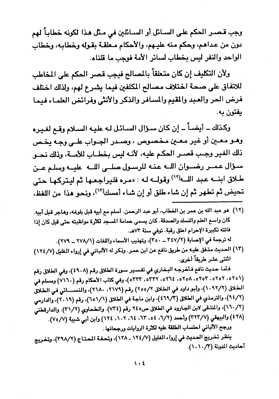 وكذلك- أيضًا- إن كان سؤال السائل له عليه السلام وقع لغيره وهو معين أو غير معين مخصوص, وصدر الجواب على وجه يخص ذلك الغير وجب قصر الحكم عليه, لأنه ليس بخطاب للأمة, وذلك نحو سؤال عمر رضوان الله عنه للرسول صلى الله عليه وسلم عن طلاق ابنه عبد الله وقوله له: "مره فليراجعها ثم ليتركها حتى تحيض ثم تطهر ثم إن شاء طلق أو إن شاء أمسك, ونحو هذا من اللفظ,