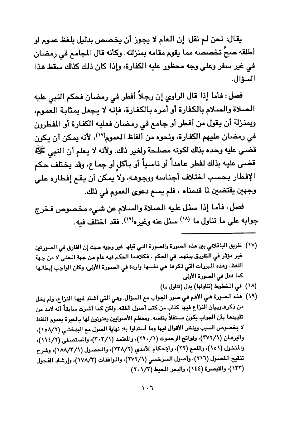 فصل: فأما إذا قال الراوي إن رجلاً أفطر في رمضان فحكم النبي عليه الصلاة والسلام بالكفارة أو أمره بالكفارة, فإنه لا يجعل بمثابة العموم, وبمنزلة أن يقول من أفطر أو جامع في رمضان فعليه الكفارة أو المفطرون في رمضان عليهم الكفارة, ونحوه من ألفاظ العموم, لأنه يمكن أن يكون قضي عليه وحده بذلك لكونه مصلحة ولغير ذلك. ولأنه يعلم أن النبي صلى الله عليه وسلم قضى عليه بذلك لفطر عامدًا أو ناسيًا أو بأكل أو جماع, وقد يختلف حكم الإفطار بحسب اختلاف أجناسه ووجوهه, ولا يمكن أن يقع إفطاره على وجهين يقتضين لما قدمناه, فلم يسع دعوى العموم في ذلك.