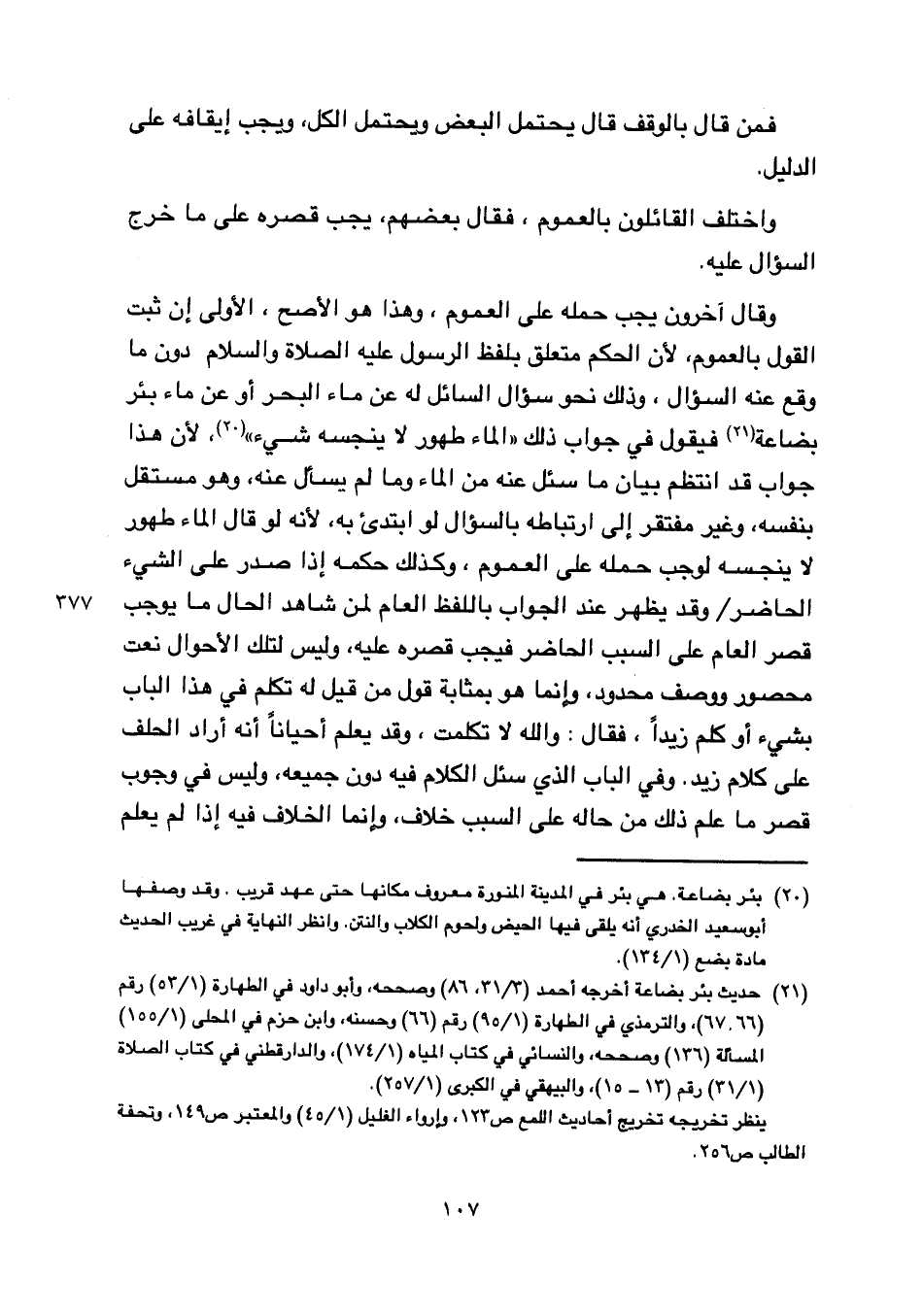 وقال آخرون يجب حمله على العموم, وهذا هو الأصح, الأولى إن ثبت القول بالعموم, لأن الحكم متعلق بلفظ الرسول عليه الصلاة والسلام دون ما وقع عنه السؤال, وذلك نحو سؤال السائل له عن ماء البحر أو عن ماء بئر بضاعة فيقول في جواب ذلك "الماء طهور لا ينجسه شيء", لأن هذا جواب قد انتظم بيان ما سئل عنه من الماء وما لم يسأل عنه, وهو مستقل بنفسه, وغير مفتقر إلى ارتباطه بالسؤال او ابتدئ به, لأنه لو قال الماء طهور لا ينجسه لوجب حمله على العموم, وكذلك حكمه إذا صدر على الشيء الحاضر/وقد يظهر الجواب باللفظ العام لمن شاهد الحال ما يوجب قصر العام على السبب الحاضر فيجب قصره عليه, وليس لتلك الأحوال نعت محصور ووصف محدود, وإنما هو بمثابة قول من قيل له تكلم في هذا الباب بشيء أو كلم زيدًا, فقال: والله لا نكلمت, وقد يعلم أحيانًا أنه أراد الحلف على كلام زيد. وفي الباب الذي سئل الكلام فيه دون جميعه, وليس في وجوب قصر ما علم ذلك من حاله على السبب خلاف, وإنما الخلاف فيه إذا لم يعلم