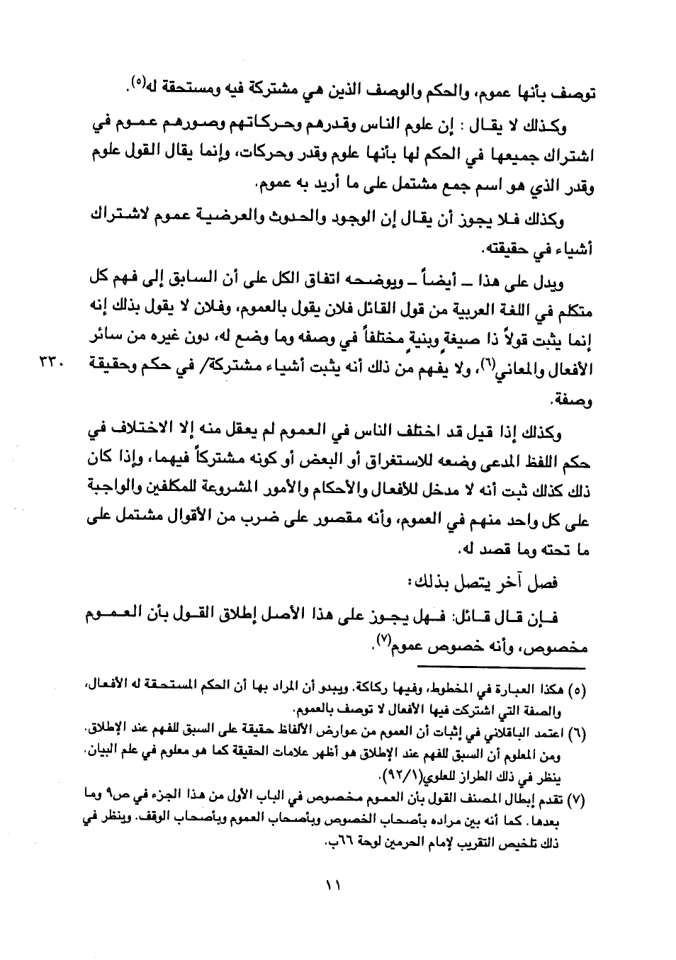 وكذلك إذا قيل قد اختلف الناس في العموم لم يعقل منه إلا الاختلاف في حكم اللفظ المدعي وضعه للاستغراق أو البعض أو كونه مشتركا فيهما, وإذا كان ذلك كذلك ثبت أنه لا مدخل للأفعال والأحكام والأمور المشروعة للمكلفين والواجبة على كل واحد منهم في العموم, وأنته مقصور على ضرب من الأقوال مشتمل على ما تحته وما قصد له.
