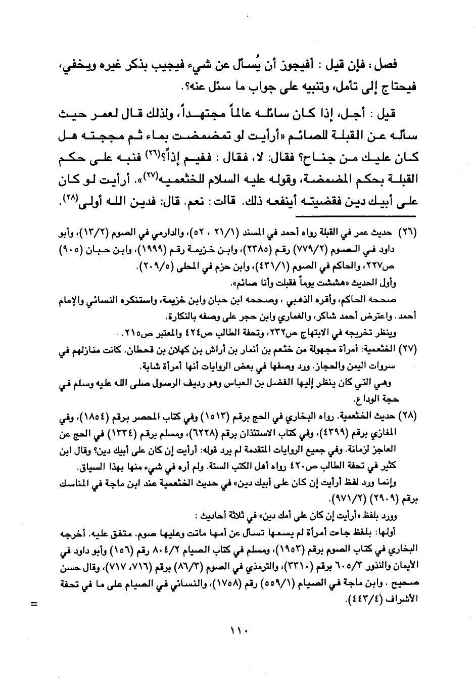 قيل: أجل, إذا كان سائله عالمًا مجتهدًا, ولذلك قال لعمر حيث سأله عن القبلة للصائم "أرأيت لو تمضمضت بماء ثم مججته هل كان عليك من جناح؟ فقال: لا, فقال: ففيم إذًا؟ فنبه على حكم القبلة بحكم المضمضة, وقوله عليه السلام للخثعمية". أرأيت لو كان على أبيك دين فقضيته أينفعه ذلك, قالت: نعم, قال: فدين الله أولى.