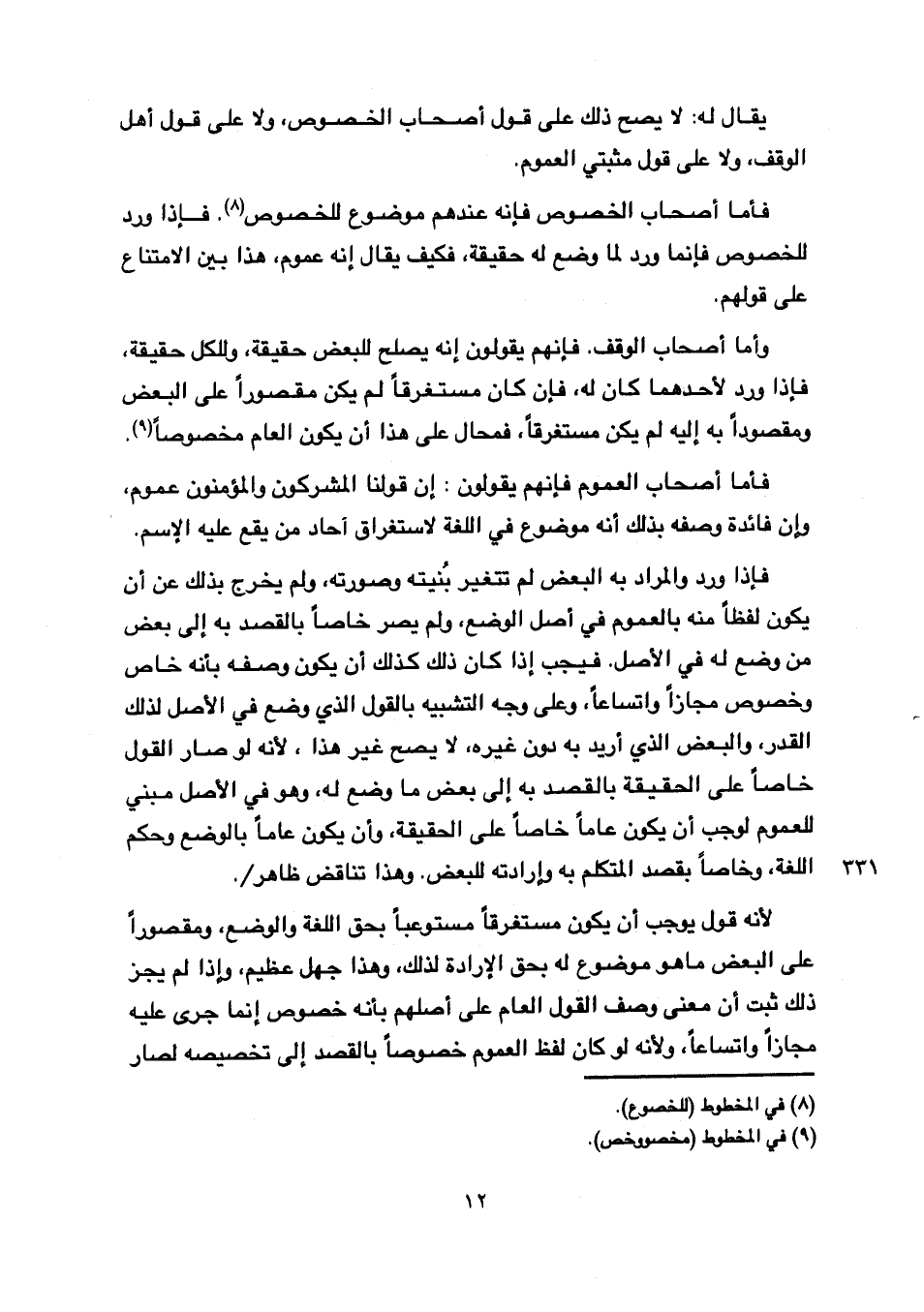 فإذا ورد والمراد به البعض لم تتغير بنيته وصورته، ولم يخرج بذلك عن أن يكون لفظا منه بالعموم في أصل الوضع, ولم يصر خاصا بالقصد به إلى بعض من وضع له في الأصل. فيجب إذا كان ذلك كذلك أن يكون وصفه بأنه خاص وخصوص مجازا واتساعا, وعلى وجه التشبيه بالقول الذي وضع في الأصل لذلك القدر, والبعض الذي أريد به دون غيره, لا يصح غير هذا، لأنه لو صار القول خاصا على الحقيقة بالقصد به إلى بعض ما وضع له, وهو في الأصل مبني للعموم لوجب أن يكون عاما خاصا على الحقيقة, وأن يكون عاما بالوضع وحكم اللغة, وخاصا بقصد المتكلم به وإرادته للبعض. وهذا تناقض ظاهر?. ص ٣٣١