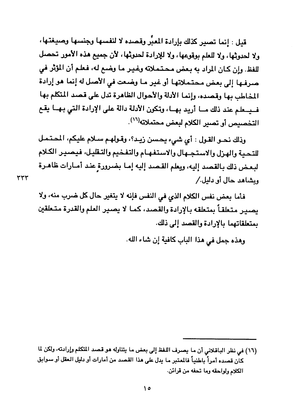 فأما بعض نفس الكلام الذي في النفس فإنه لا يتغير حال كل ضرب منه, ولا يصير متعلقا بمتعلقة بالإدارة والقصد, كما لا يصير العلم والقدرة متعلقين بمتعلقاتها بالإرادة والقصد إلى ذلك.
