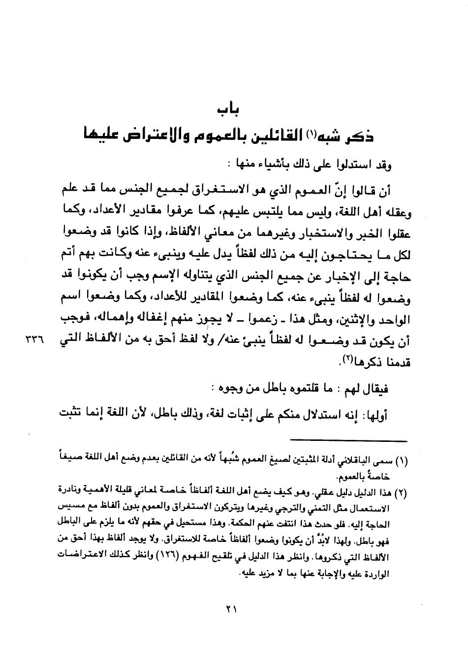 أن قالوا إن العموم الذي هو الاستغراق لجميع الجنس مما قد علم وعقله أهل اللغة, وليس مما يلتبس عليهم, كما عرفوا مقادير الأعداد, وكما عقلوا الخبر والاستخبار وغيرهما من معاني الألفاظ, وإذا كانوا قد وضعوا لكل ما يحتاجون إليه من ذلك لفظا يدل عليه وينبئ عنه وكانت بهم أتم حاجة إلى الإخبار عن جميع الجنس الذي يتناوله الاسم وجب أن يكونوا قد وضعوا له لفظا ينبئ عنه, كما وضعوا المقادير للأعداد, وكما وضعوا اسم الواحد والاثنين, ومثل هذا- زعموا- لا يجوز منهم إغفاله وإهماله, فوجب أن يكون قد وضعوا لفظا ينبئ عنه ⦗٣٣٦⦘ ولا لفظ أحق به من الألفاظ التي قدمنا ذكرها.
