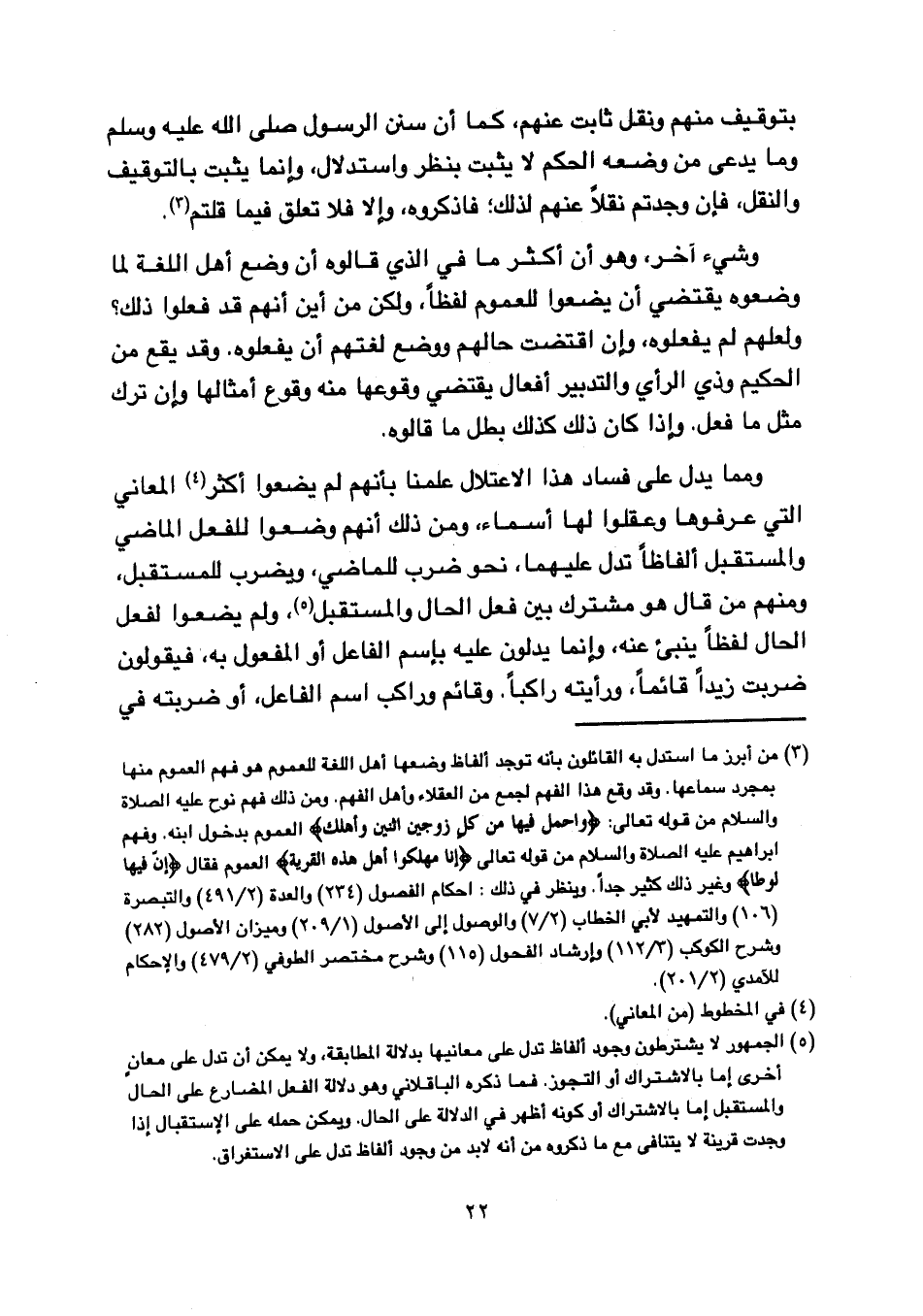 ومما يدل على فساد هذا الاعتلال علمنا بأنهم لم يضعوا أكثر المعاني التي عرفوها وعقلوا لها أسماء, ومن ذلك أنهم وضعوا للفعل الماضي والمستقبل ألفاظا تدل عليهما, نحو ضرب للماضي, ويضرب للمستقبل, ومنهم من قال هو مشترك بين فعل الحال والمستقبل, ولم يضعوا لفعل الحال لفظا ينبئ عنه, وإنما يدلون عليه باسم الفاعل أو المفعول به, فيقولون ضربت زيدا قائما, ورأيته راكبا. وقائم وراكب اسم الفاعل, أو ضربته في