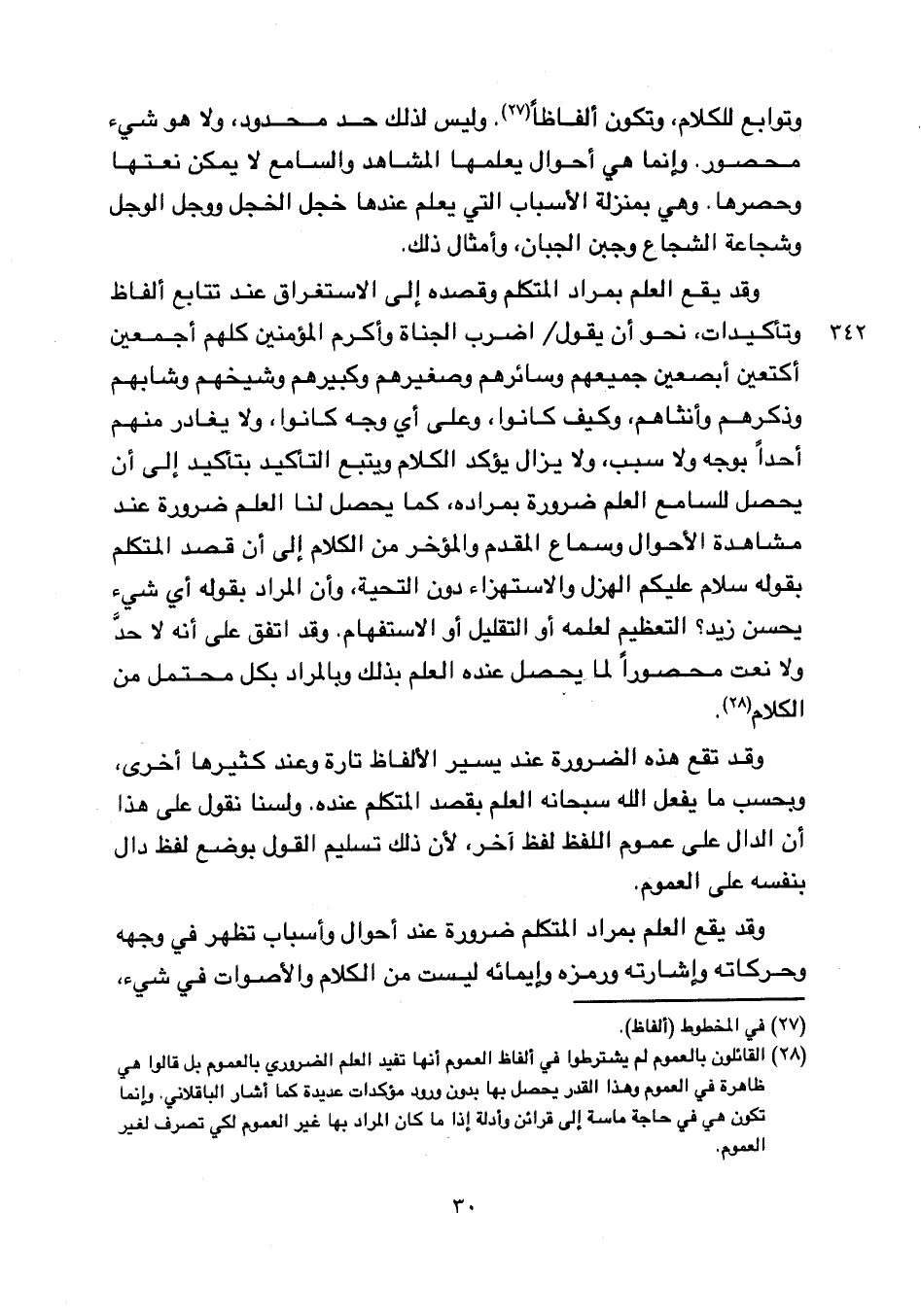 وقد تقع هذه الضرورة عند يسير الألفاظ تارة وعند كثيرها أخرى، وبحسب ما يفعل الله سبحانه العلم بقصد المتكلم عنده. ولسنا نقول على هذا أن الدال على عموم اللفظ لفظ آخر، لأن ذلك تسليم القول بوضع لفظ دال بنفسه على العموم.