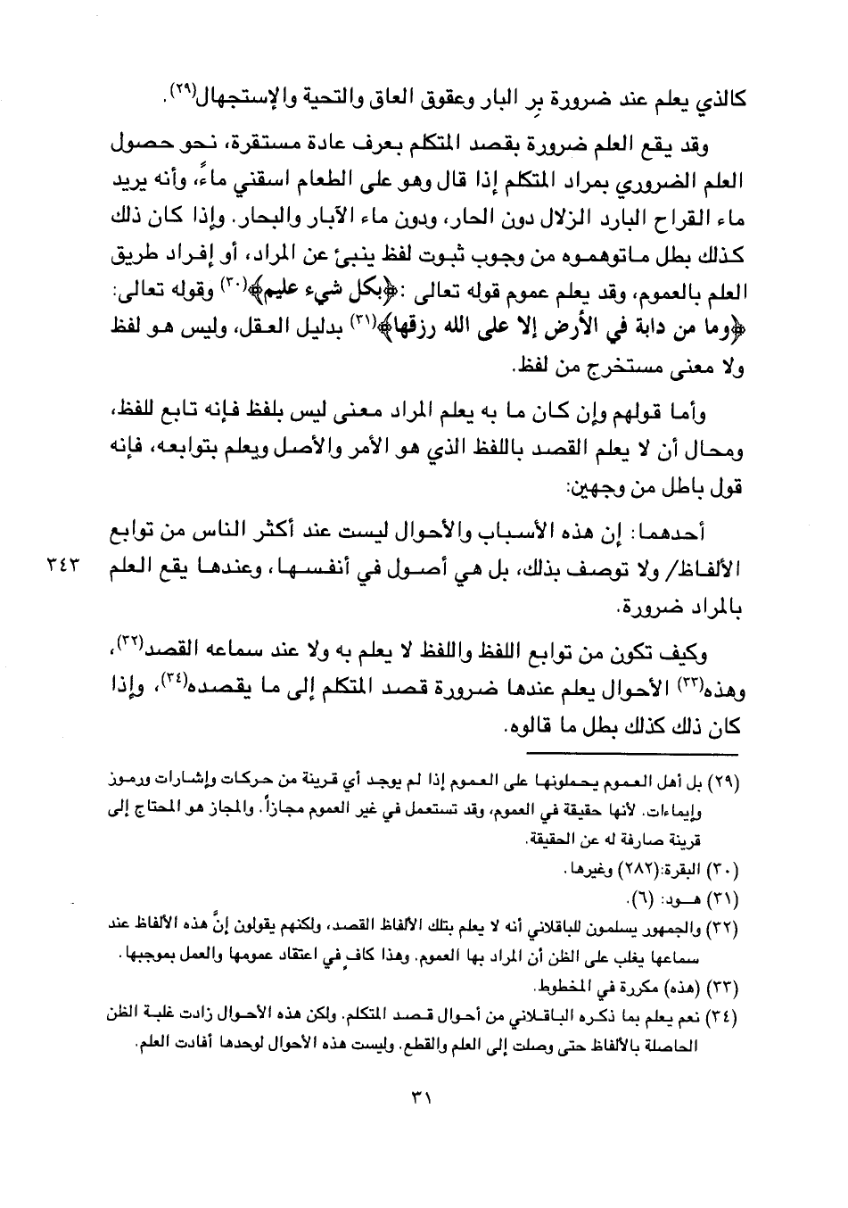 وقد يقع العلم ضرورة بقصد المتكلم يعرف عادة مستقرة، نحو حصول العلم الضروري بمراد المتكلم إذا قال وهو على الطعام اسقني ماء، وأنه يريد ماء القراح البارد الزلال دون الحار، ودون ماء الآبار والبحار وإذا كان ذلك كذلك بطل ما توهموه من وجوب ثبوت لفظ ينبئ عن المراد، أو إفراد طريق العلم بالعموم، وقد يعلم عموم قوله تعالى: (بِكُلِّ شَيْءٍ عَلِيمٌ) وقوله تعالى: (ومَا مِن دَابَّةٍ فِي الأَرْضِ إلاَّ عَلَى اللَّهِ رِزْقُهَا) بدليل العقل، وليس هو لفظ ولا معنى مستخرج من لفظ.