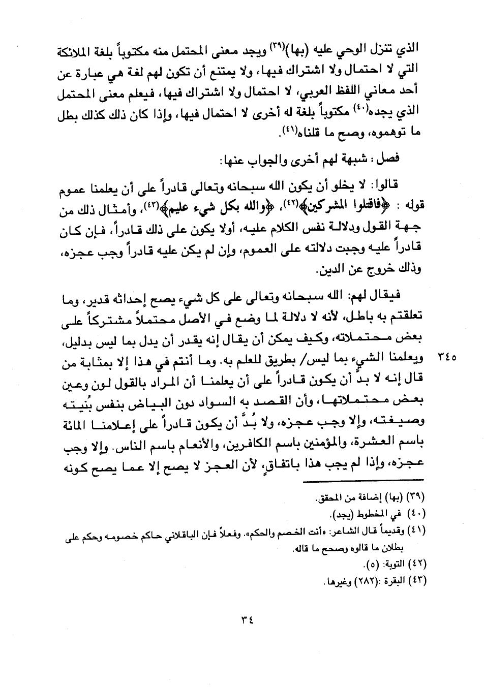 فيقال لهم: الله سبحانه وتعالى على كل شيء يصح إحداثه قدير، وما تعلقتم به باطل، لأنه لا دلالة لما وضع في الأصل محتملا مشتركا على بعض محتملاته وكيف يمكن أن يقال إنه يقدر أن يدل بما ليس بدليل، ويعلمنا الشيء بما ليس/ بطريق للعلم به. وما أنتم في هذا إلا بمثابة من قال إنه لابد أن يكون قادراً على أن يعلمنا أن المواد بالقول لون وعين بعض محتملاتها، وأن القصد به السواد دون البياض بنفس بنيته وصبغته، وإلا وجب عجزه، ولابد أن يكون قادرا على إعلامنا المائة باسم العشرة، والمؤمنين باسم الكافرين، والإنعام باسم الناس. وإلا وجب عجزه، وإذا لم يجب هذا باتفاق، لأن العجز لا يصح إلا عما يصح كونه