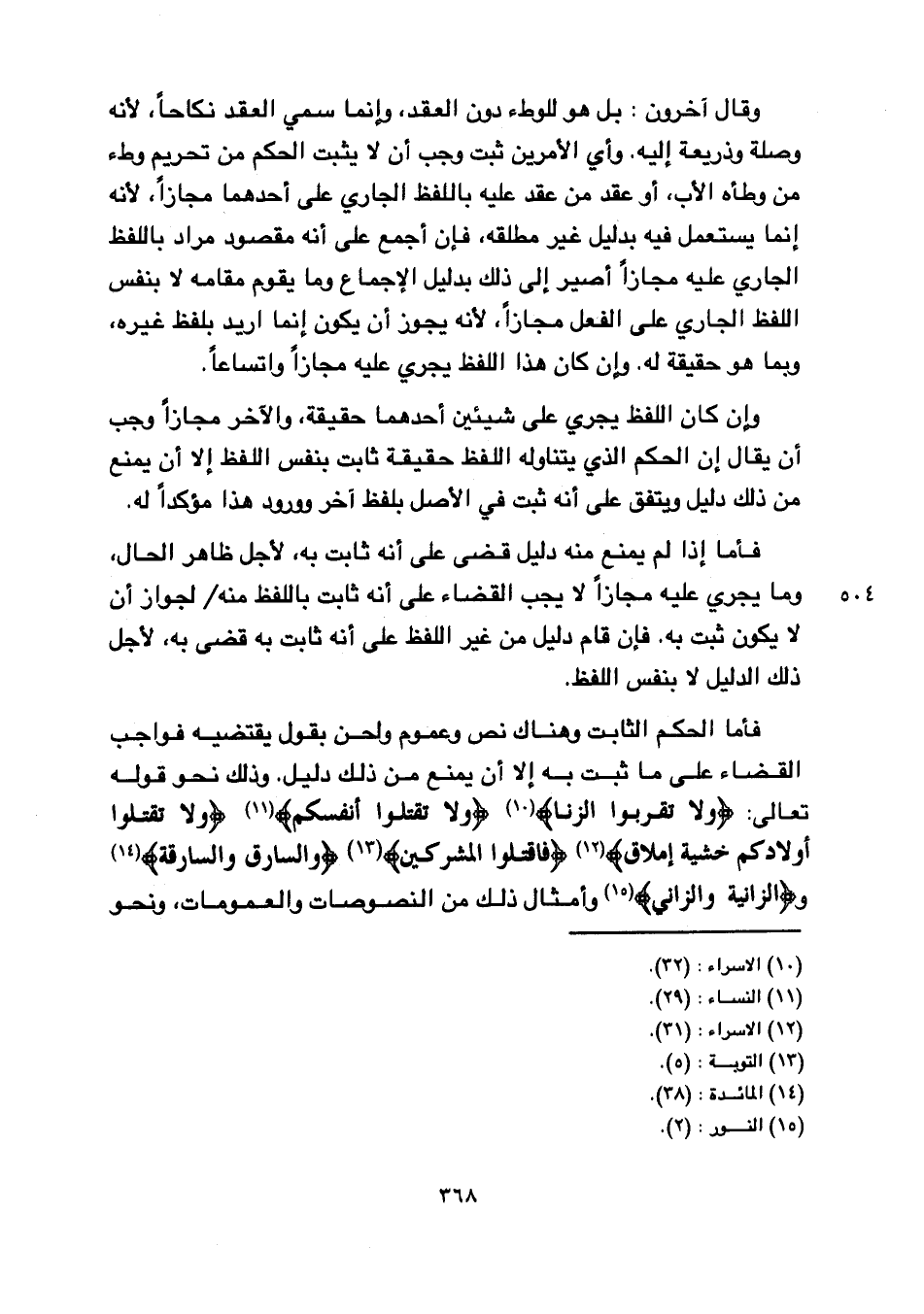 فأما الحكم الثابت وهناك نص وعموم ولحن بقوله يقتضيه فواجب القضاء علي م ثبت به إلا أن يمنع من ذلك دليل. وذلك نحو قوله تعالى: {ولا تَقْرَبُوا الزِّنَى} {ولا تَقْتُلُوا أَنفُسَكُمْ} {ولا تَقْتُلُوا أَوْلادَكُمْ خَشْيَةَ إمْلاقٍ} {فَاقْتُلُوا المُشْرِكِينَ} {فَاقْتُلُوا المُشْرِكِينَ} و {الزَّانِيَةُ والزَّانِي} وأمثال ذلك من النصوصات والعمومات، ونحو