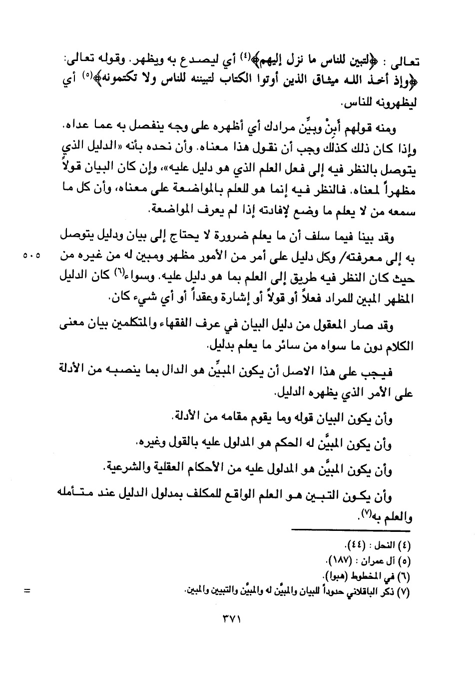 ومنه قولهم ابنة وبين مرادك أي أظهره على وجه ينفصل به عما عداه. وإذا كان ذلك كذلك وجب أن نقول هذا معناه. وأن نحده بأنه "الدليل الذي يتوصل بالنظر فيه إلى فعل العلم الذي هو دليل عليه"، وإن كان البيان قولاً مظهراً لمعناه. فالنظر فيه إنما هو للعلم بالمواضعة على معناه، وأن كل ما سمعه من لا يعلم ما وضع لإفادته إذا لم يعرف المواضعة.