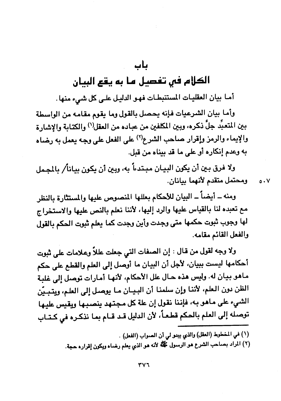 وأما بيان الشرعيات فإنه يحصل بالقول وما يقوم مقامه من الواسطة بين المتعبد جل ذكره، وبين المكلفين من عباده من العقل والكتابة والإشارة والإيماء والرمز وإقرار صاحب الشرع على الفعل على وجه يعمل به رضاه به وعدم إنكاره أو على ما قد بيناه من قبل.
