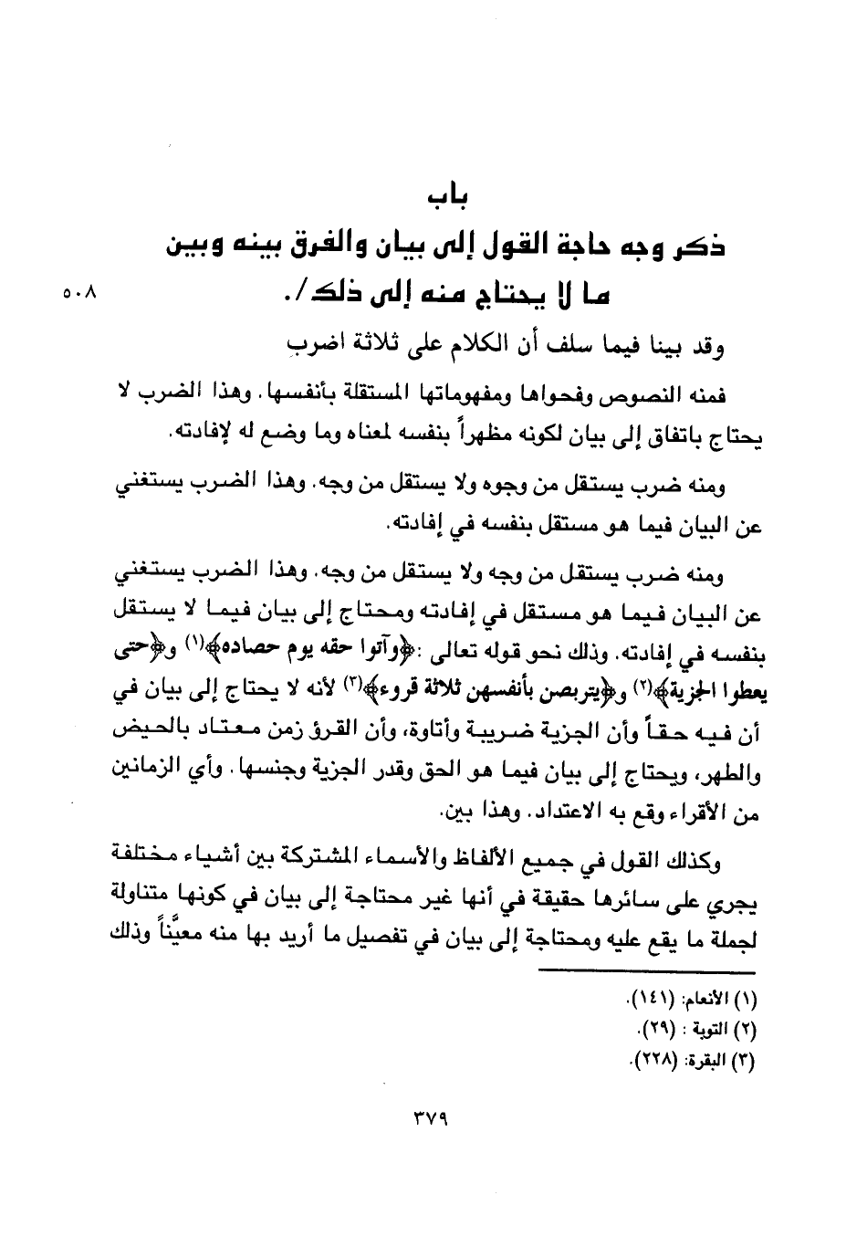 فمنه النصوص وفحواها ومفهوماتها المستقلة بأنفسها. وهذا الضرب لا يحتاج باتفاق إلى بيان لكونه مظهرا بنفسه لمعناه وما وضع له لإفادته. ومنه ضرب يستقبل من وجوه ولا يستقبل من وجه. وهذا الضرب يستغني عن البيان فيما هو مستقل بنفسه في إفادته. ومنه ضرب يستقبل من وجه ولا يستقبل من وجه. وهذا الضرب يستغني عن البيان فيما هو مستقل في إفادته ومحتاج إلى بيان فيما لا يستقل بنفسه في إفادته. وذلك نحو قوله تعالى: {وآتُوا حَقَّهُ يَوْمَ حَصَادِهِ} و {حَتَّى يُعْطُوا الجِزْيَةَ} و {يَتَرَبَّصْنَ بِأَنفُسِهِنَّ ثَلاثَةَ قُرُوءٍ} لأنه لا يحتاج إلى بيان في أن فيه حقا وأن الجزية ضريبة وأتاوة, وأن القرؤ زمن معتاد بالحيض والطهر, ويحتاج إلى بيان فيما هو الحق وقدر الجزية وجنسها. وأي الزمانين من الأقراء وقع به الاعتداد. وهذا بين.