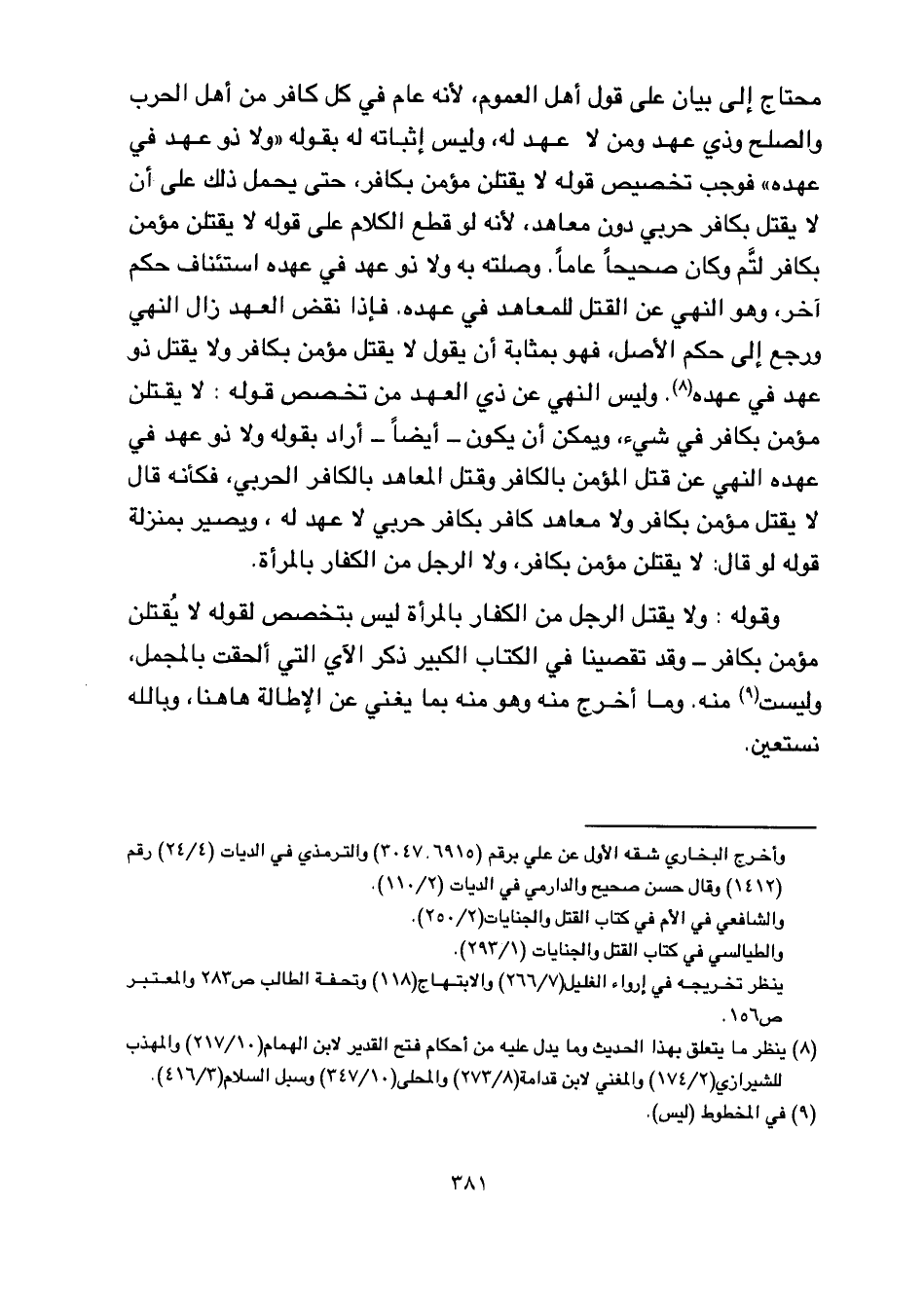 محتاج إلى بيان على قول أهل العموم, لأنه عام في كل كافر من أهل الحرب والصلح وذي عهد ومن لا عهد له, وليس إثباته له بقوله" ولا ذو عهد في عهده" فوجب تخصيص قوله لا يقتلن مؤمن بكافر, حتى يحمل ذلك على أن لا يقتل بكافر حربي دون معاهد, لأنه لو قطع الكلام على قوله لا يقتلن مؤمن بكافر لتم وكان صحيحا عاما. وصلته به ولا ذو عهد في عهده استئناف حكم آخر, وهو النهي عن القتل للمعاهد في هده. فإذا نقض العهد زال النهي ورجع إلى حكم الأصل، فهو بمثابة أن يقول لا يقتل مؤمن بكافر ولا يقتل ذو عهد في عهده. وليس النهي عن ذي العهد من تخصص قوله: لا يقتلن مؤمن بكافر في شيء ويمكن أن يكون- أيضا- أراد بقوله ولا ذو عهد في عهد النهي عن قتل المؤمن بالكافر وقتل المعاهد بالكافر الحربي, فكأنه قال لا يقتل مؤمن بكافر ولا معاهد كافر بكافر حربي لا عهد له, ويصير بمنزلة قوله او قال: لا يقتلن مؤمن بكافر، ولا الرجل من الكفار بالمرأة.