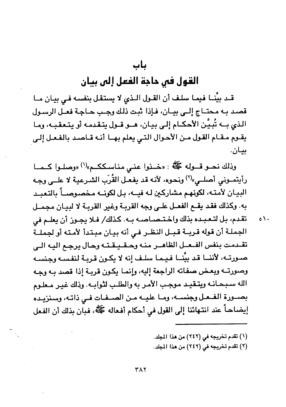 قد بينا فيما سلف أن القول الذي لا يستقل بنفسه في بيان ما قصد به محتاج إلى بيان, فإذا ثبت ذلك وجب حاجة فعل الرسول الذي به تبين الأحكام إلى بيان, هو قول يتقدمه أو يتعقبه, وما يقوم مقام القول من الأحوال التي يعلم بها أنه قاصد بالفعل إلى بيان.