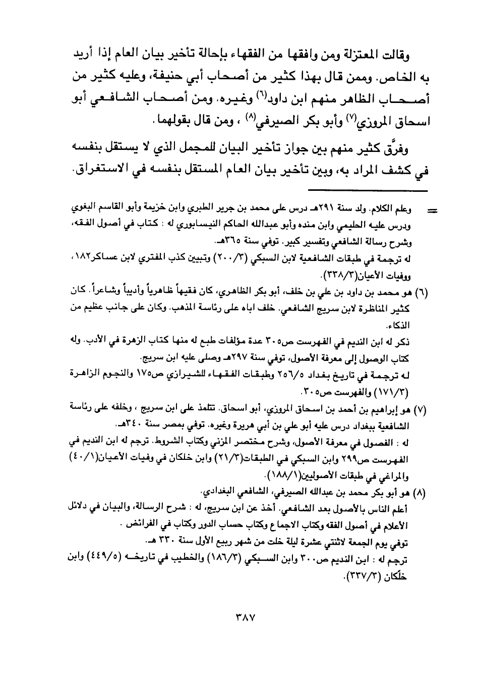 وقالت المعتزلة ومن وافقها من الفقهاء بإحالة تأخير بيان العام إذا أريد به الخاص. وممن قال بهذا كثير من أصحاب أبي حنيفة, وعليه كثير من أصحاب الظاهر منهم ابن داود وغيره. ومن أصحاب الشافعي أبو إسحاق المررزي وأبو بكر الصيرفي, ومن قال بقولهما.