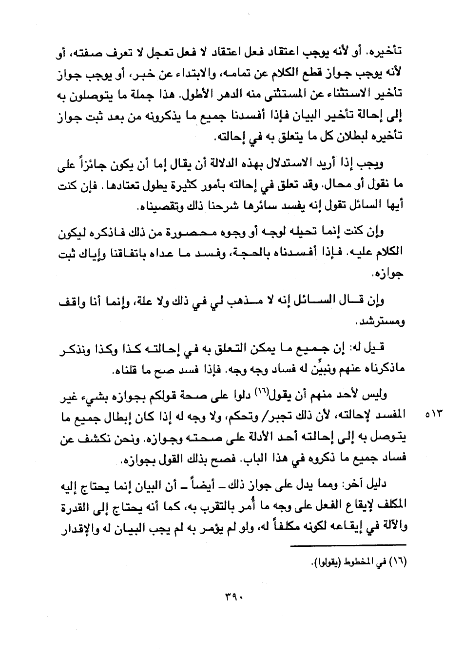 تأخيره. أو لأنه يوجب اعتقاد فعل اعتقاد لا فعل تعجل لا تعرف صفته, أو لأنه يوجب جواز قطع الكلام عن تمامه, والابتداء عن خبر, أو يوجب جواز تأخير الاستثناء عن المستثنى منه الدهر الأطول. هذا جملة ما يتوصلون به إلى إحالة تأخير البيان فإذا أفسدنا جميع ما يذكرونه من بعد ثبت جواز تأخيره لبطلان كل ما يتعلق به في إحالته.