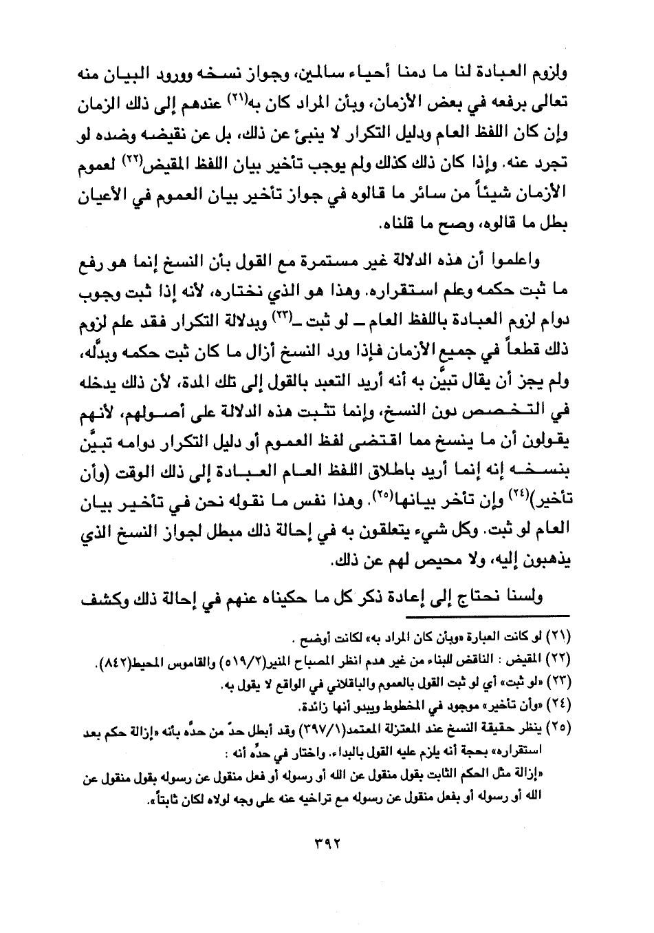 ولزوم العبادة لنا ما دمنا أحياء سالمين, وجواز نسخه وورود البيان منه تعالى برفعه في بعض الأزمان، وبأن المراد كان به عندهم إلى ذلك الزمان وإن كان اللفظ العام ودليل التكرار لا ينبئ عن ذلك, بل عن نقيضه وضده لو تجرد عنه. وإذا كان كذلك ولم يوجب تأخير بيان اللفظ المقيض لعموم الأزمان شيئا من سائر ما قالوه في جواز تأخير بيان العموم في الأعيان بطل ما قالوه, وصح ما قلناه.
