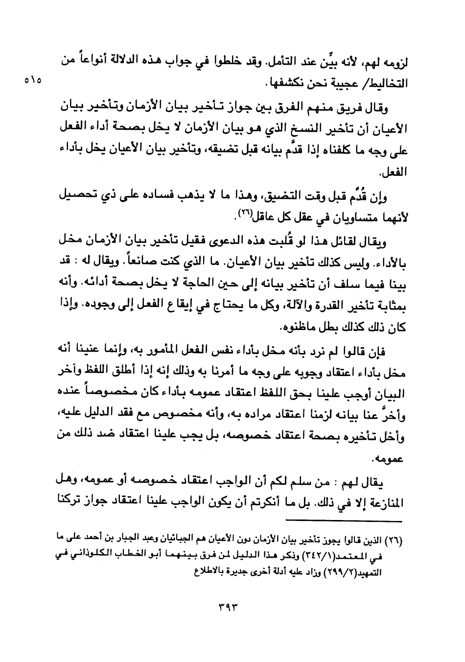 وقال فريق منهم الفرق بين جواز تأخير بيان الأزمان وتأخير بيان الأعيان أن تأخير النسخ الذي هو بيان الأزمان لا يخل بصحة أداء الفعل على مجه ما كلفناه إذا قدم بيانه قبل تضيقه, وتأخير بيان الأعيان يخل بأداء الفعل.