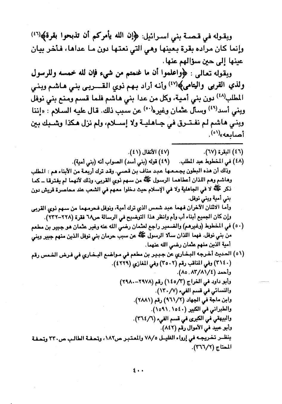 وبقوله تعالى: {واعْلَمُوا أَنَّمَا غَنِمْتُم مِّن شَيْءٍ فَأَنَّ لِلَّهِ خُمُسَهُ ولِلرَّسُولِ ولِذِي القُرْبَى والْيَتَامَى} وأنه أراد بهم ذوي القربى بني هاشم وبني المطلب دون بني أمية, وكل من عدا بني هاشم فلما قسم ومنع ني نوفل وبني أسد وسأل عثمان وغيره عن سبب ذلك. قال عليه السلام:" إننا وبني هاشم لم نفترق في جاهلية ولا إسلام, ولم نزل هكذا وشبك بين أصابعه"