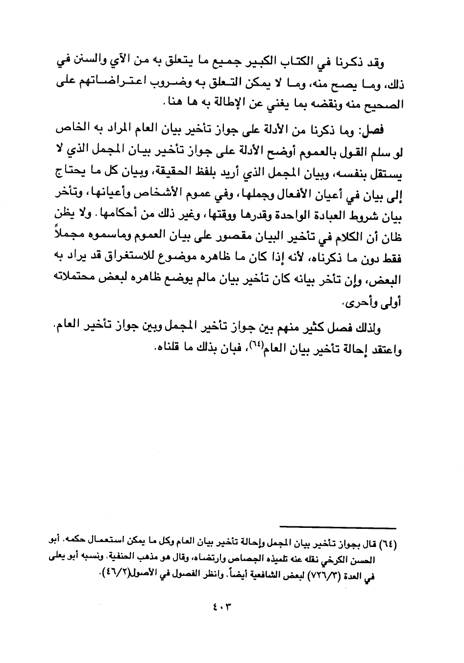 فصل: وما ذكرنا من الأدلة على جواز تأخير بيان العام المراد به الخاص لو سلم القول بالعموم أوضح على جواز تأخير بيان المجمل الذي لا يستقل بنفسه, وبيان المجمل الذي أريد بلفظ الحقيقة, وبيان كل ما يحتاج إلى بيان أعيان الأفعال وجملها, وفي عموم الأشخاص وأعيانها, وتأخر بيان شروط العبادة الواحدة وقدرها ووقتها, وغير ذلك من أحكامها. ولا يظن ظان أن الكلام في تأخير البيان مقصور على بيان العموم وما سموه مجملا فقط دون ما ذكرناه, لأنه إذا كان ما ظاهره موضوع للاستغراق قد يراد به البعض, وإن تأخر بيانه كان تأخير بيان مالم يوضع ظاهرة لبعض محتملاته أولى وأحرى.