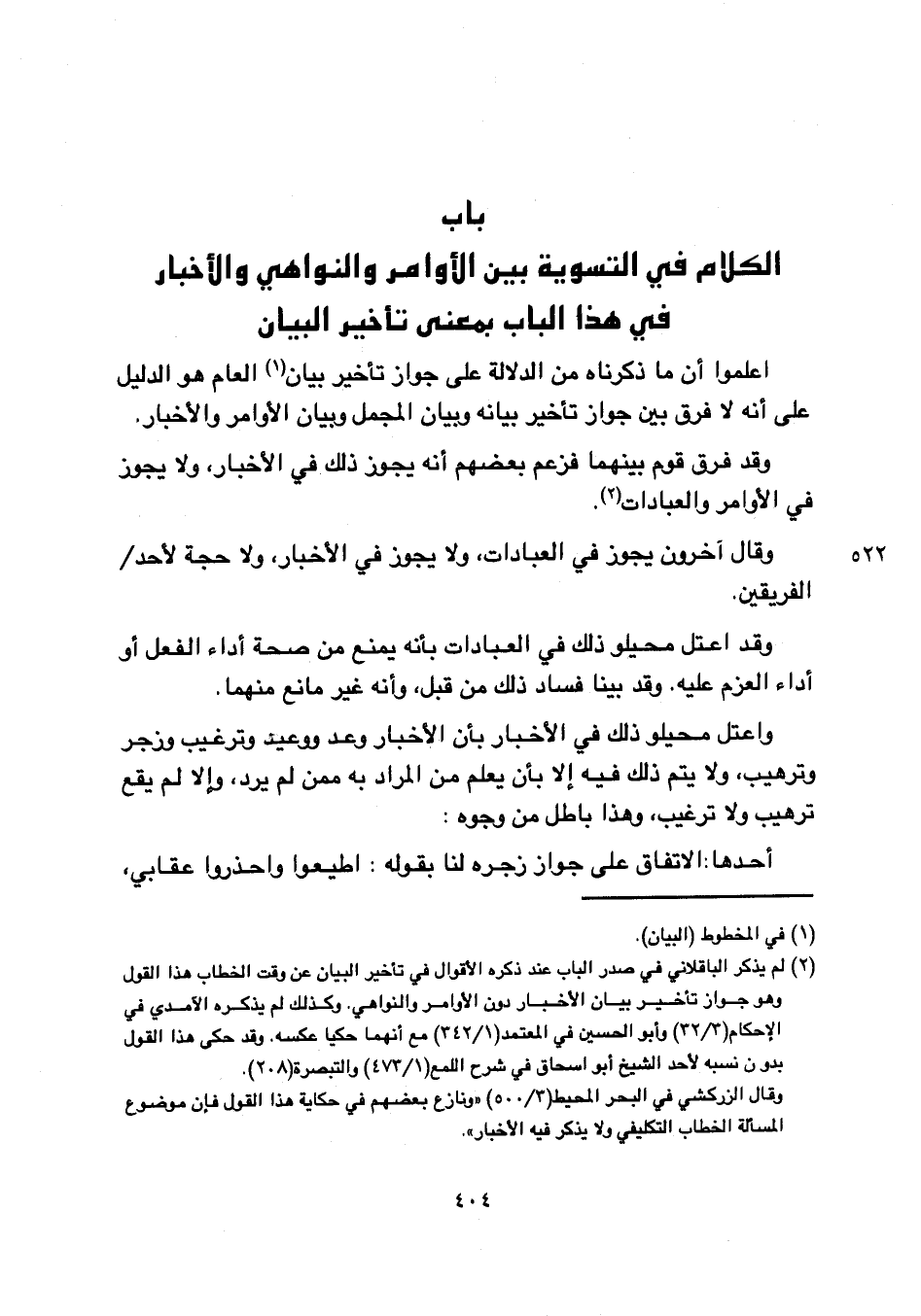 اعلموا أن ما ذكرناه من الدلالة على جواز تأخير بيان العام هو الدليل على أنه لا فرق بين جواز تأخير بيانه وبين المجمل وبيان الأوامر والأخبار.