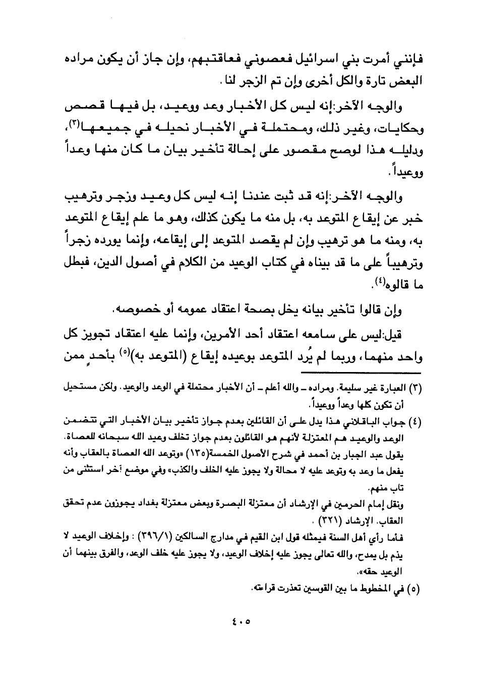 والوجه الآخر: إنه ليس كل الأخبار وعد ووعيد, بل فيها قصص وحكايات, وغير ذلك, ومحتملة في الأخبار نحيله في جميعها, ودليله هذا لوضح مقصور على إحالة تأخير بيان ما كان منها وعدا ووعيدا. والوجه الآخر: إنه قد ثبت عندنا إنه ليس كل وعيد وزجر وترهيب خبر عن إيقاع المتوعد به، بل منه ما يكون كذلك, وهو ما علم إيقاع المتوعد به, ومنه ما هو ترهيب وإن لم يقصد المتوعد إلى إيقاعه, وإنما يورده زجرا وترهيبا على ما قد بيناه في كتاب الوعيد من الكلام في أصول الدين, فبطل ما قالوه.